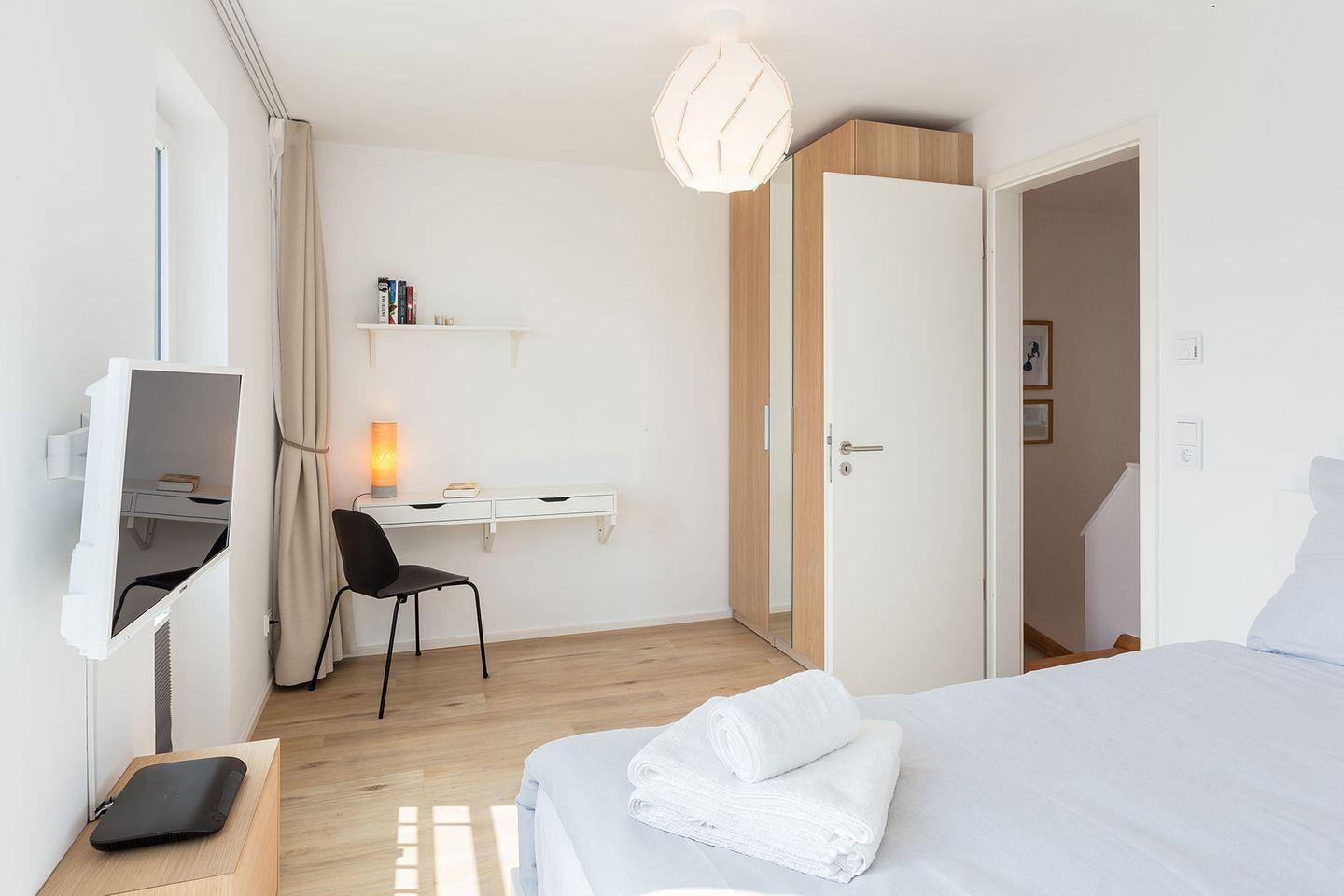 Das Ferienhaus "Meerliebe" besticht durch bodentiefe Panoramafenster, die alle Räume mit natürlichem Licht versorgen und den Blick auf das glitzernde Wasser freigeben. Der offene Wohn- und Essbereich im Erdgeschoss ermöglicht direkten Zugang zur Terrasse. Die vollausgestattete Küche mit Induktionsherd und hochwertigen Bosch-Geräten lädt zum Kochen ein. Ein Waschtrockner und eine Nespresso-Maschine stehen ebenfalls zur Verfügung.