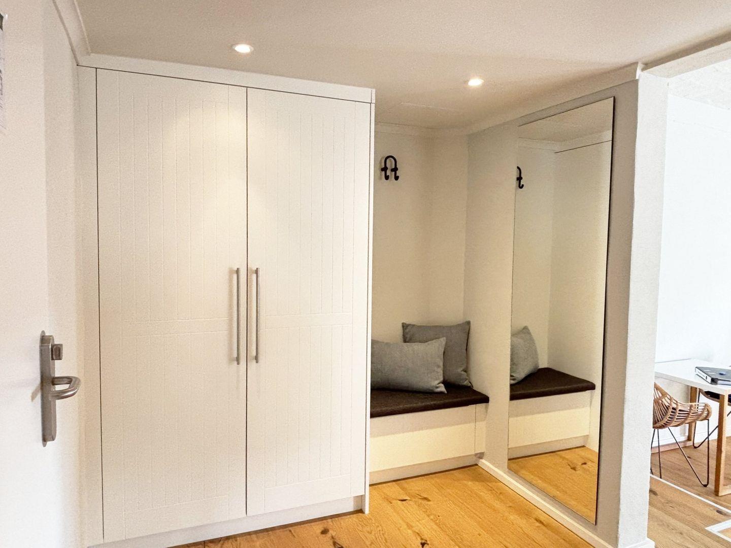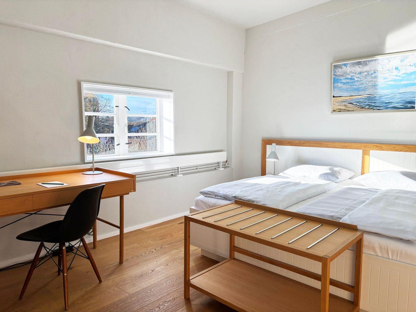 Das Appartement liegt in der sechsten Etage des Pierspeichers und ist bequem über einen Aufzug oder das Treppenhaus erreichbar. Der offene Wohnbereich ist mit einem kleinen Esstisch, einem Schreibtisch, einem Sessel sowie einem Sofa und einer Kommode ausgestattet. Der Schlafbereich verfügt über ein komfortables Doppelbett (180x200 cm) mit getrennten Matratzen und offenem Fußende, ergänzt durch einen Kleiderschrank, Kofferablage und Verdunklungsmöglichkeiten für erholsame Nächte.