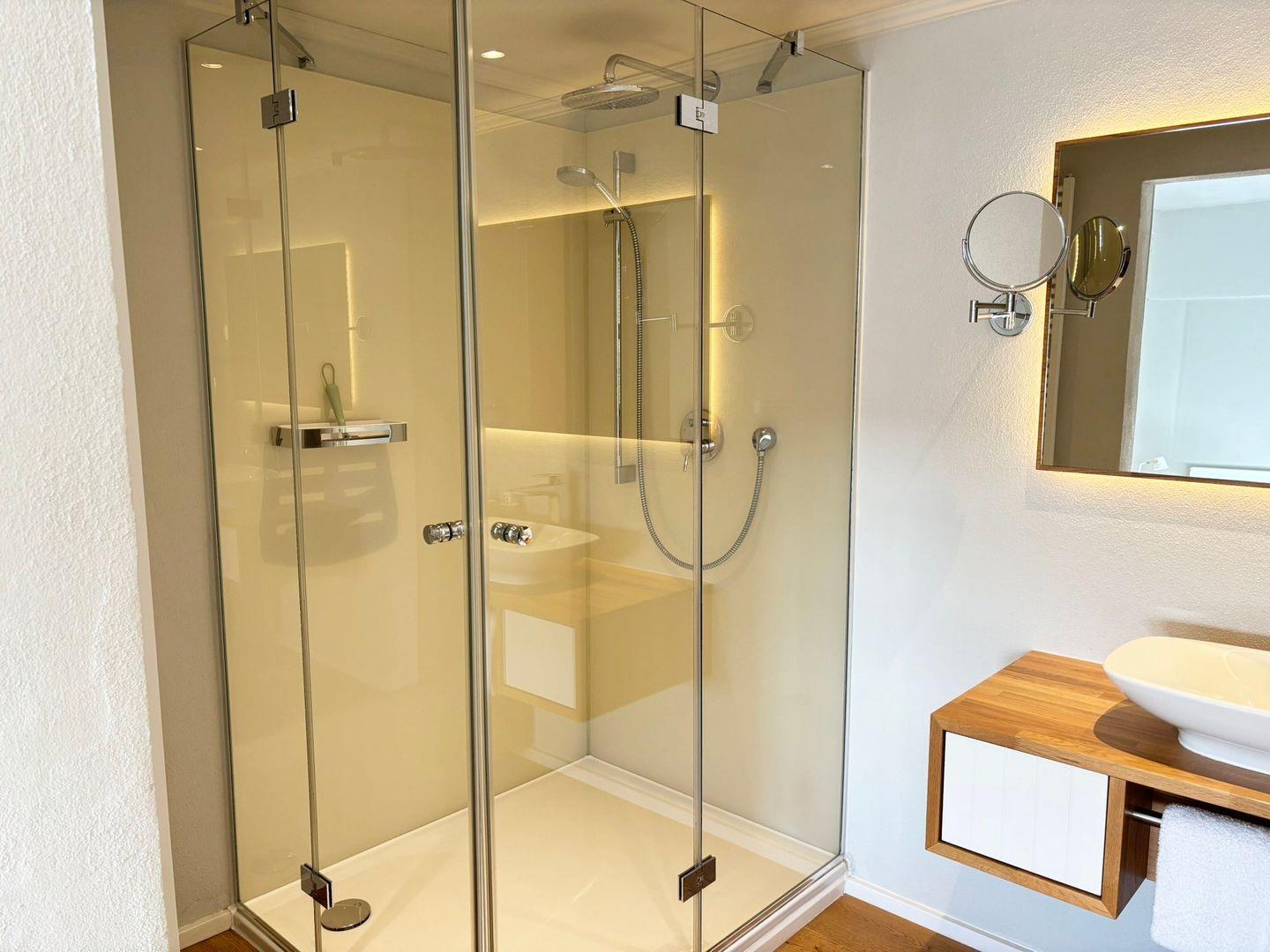 Das angrenzende Badezimmer ist modern ausgestattet mit einer ebenerdigen Dusche, WC, Waschbecken, Haartrockner und Kosmetikspiegel – alles für Ihr Wohlbefinden.