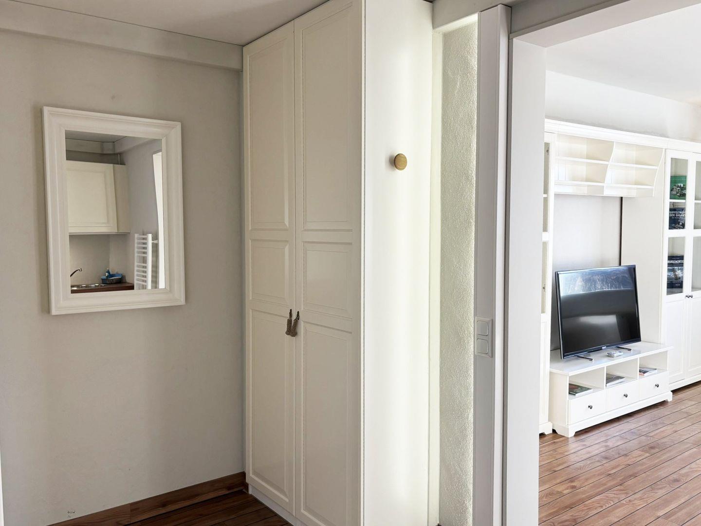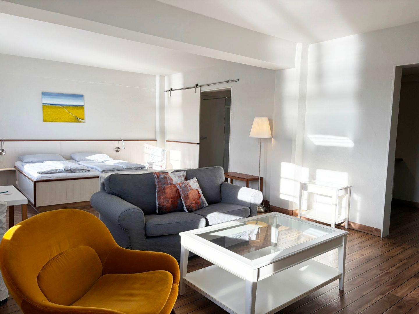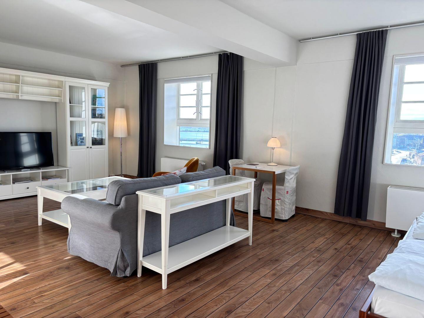 Das Appartement liegt in der fünften Etage des Pierspeichers und ist bequem über einen Aufzug oder das Treppenhaus erreichbar. Der offene Wohnbereich ist mit einem Esstisch, Sessel sowie einem Sofa und einem TV-Gerät ausgestattet. Der Schlafbereich verfügt über ein komfortables Doppelbett (180x200 cm) mit getrennten Matratzen und offenem Fußende, ergänzt durch einen Kleiderschrank, Kofferablage und Verdunklungsmöglichkeiten für erholsame Nächte.