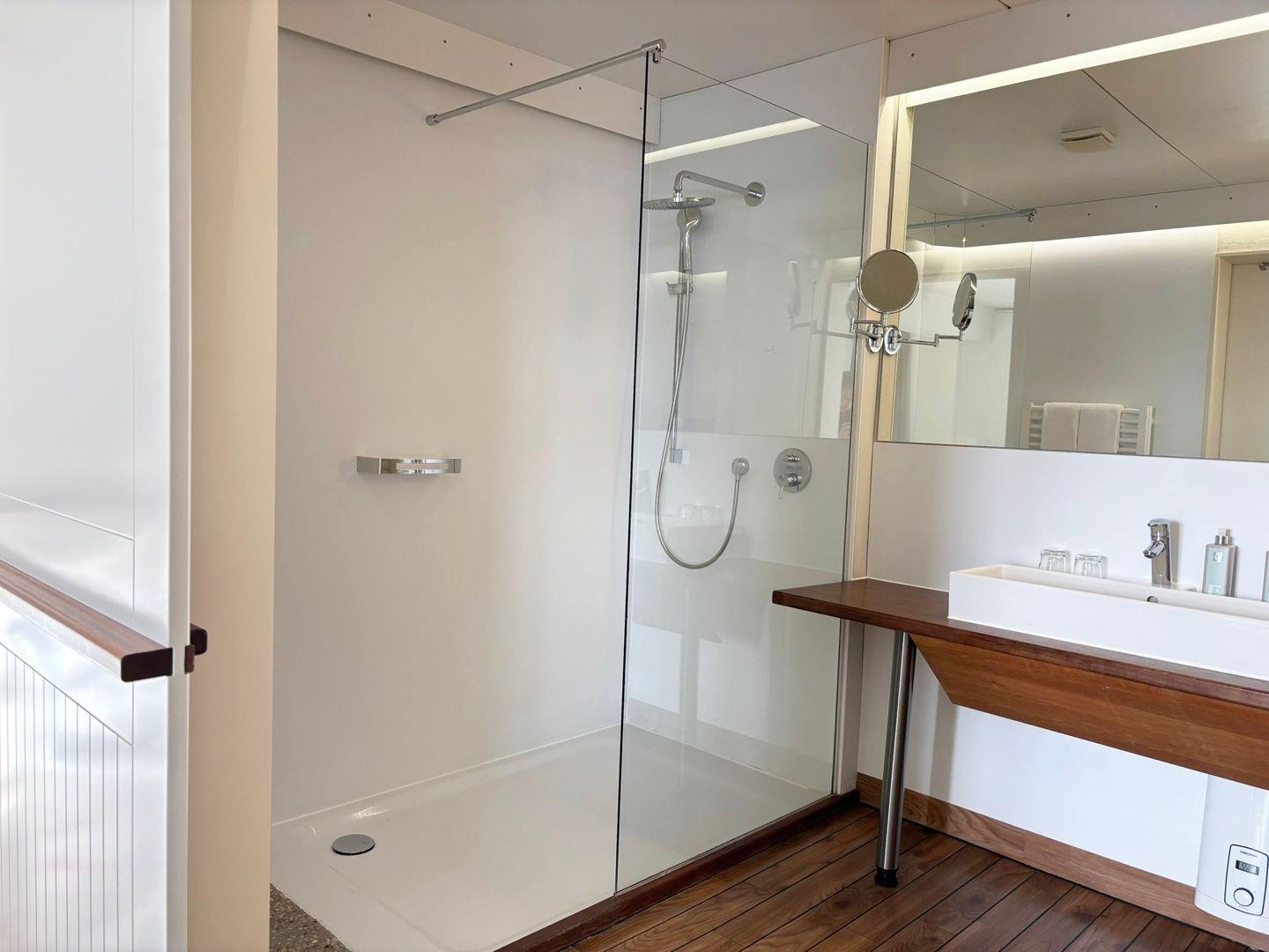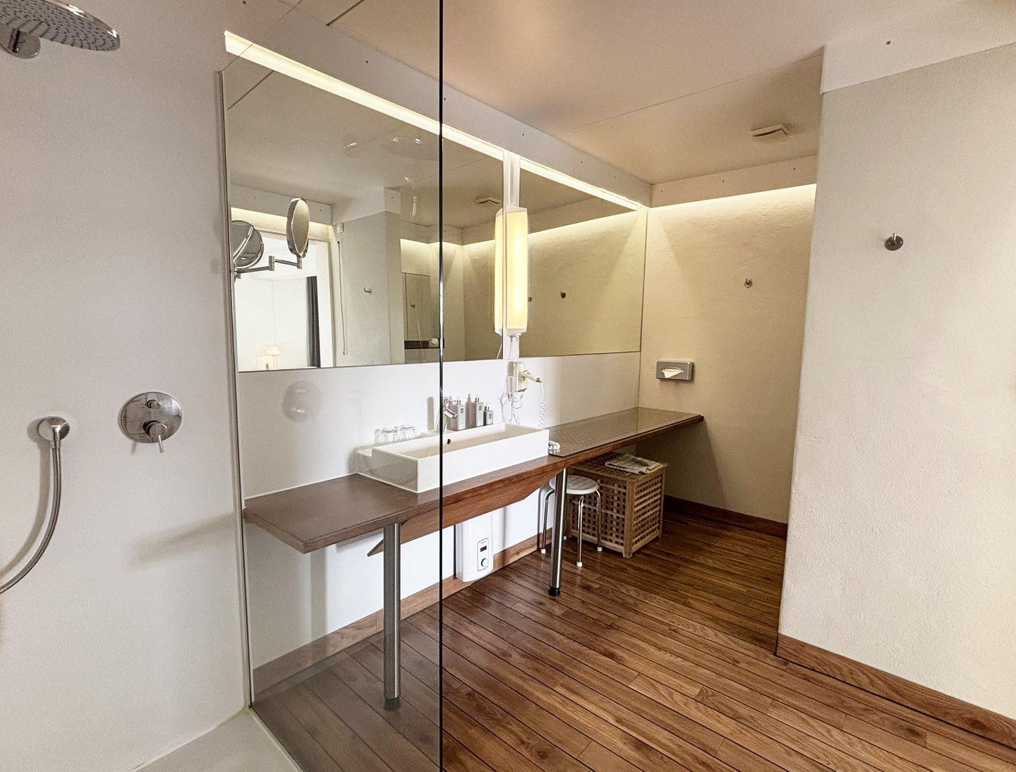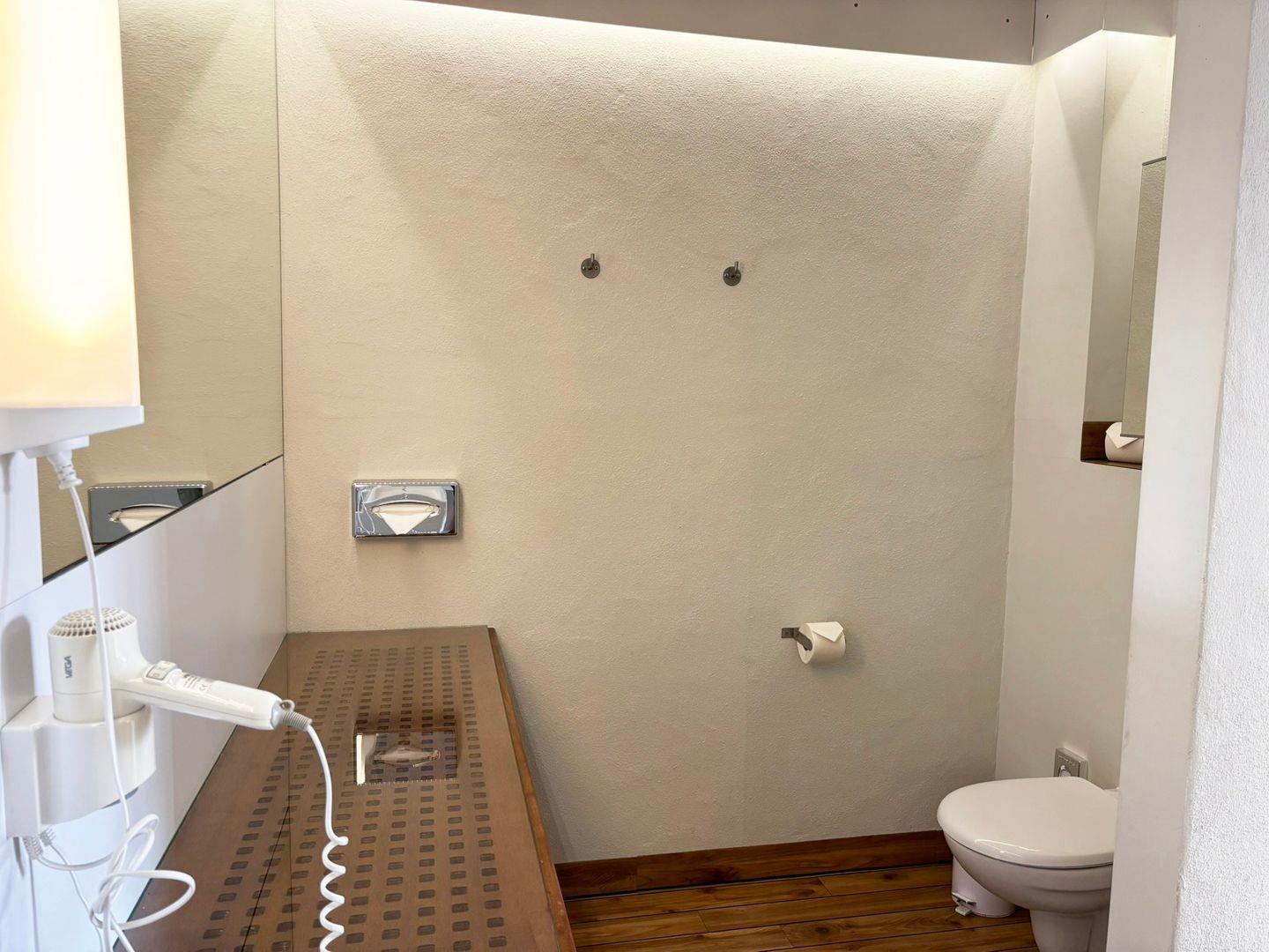 Das Badezimmer ist funktional in zwei separate Räume aufgeteilt: In einem Raum finden Sie das WC, während der andere Raum mit einer Dusche, Haartrockner, Kosmetikspiegel, Spiegel und einem Waschbecken ausgestattet ist.