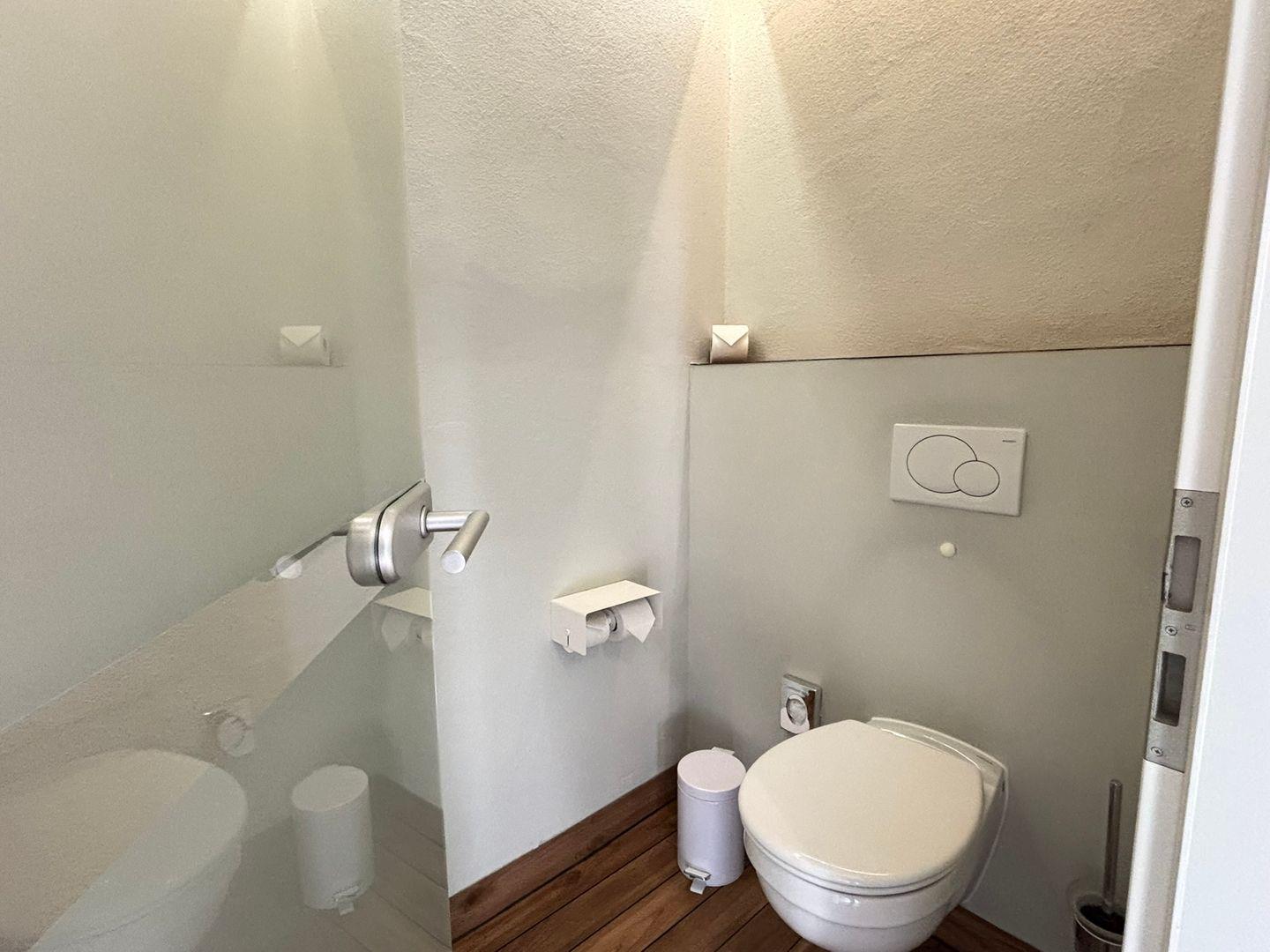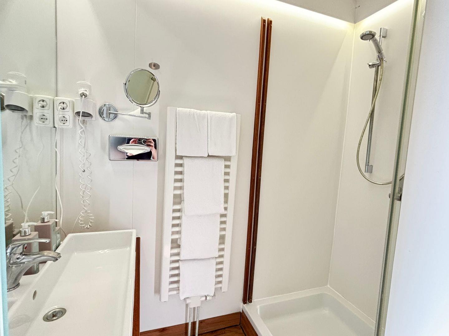 Das Badezimmer ist funktional in zwei separate Räume aufgeteilt: In einem Raum finden Sie das WC, während der andere Raum mit einer Dusche, Haartrockner, Kosmetikspiegel, Spiegel und einem Waschbecken ausgestattet ist.