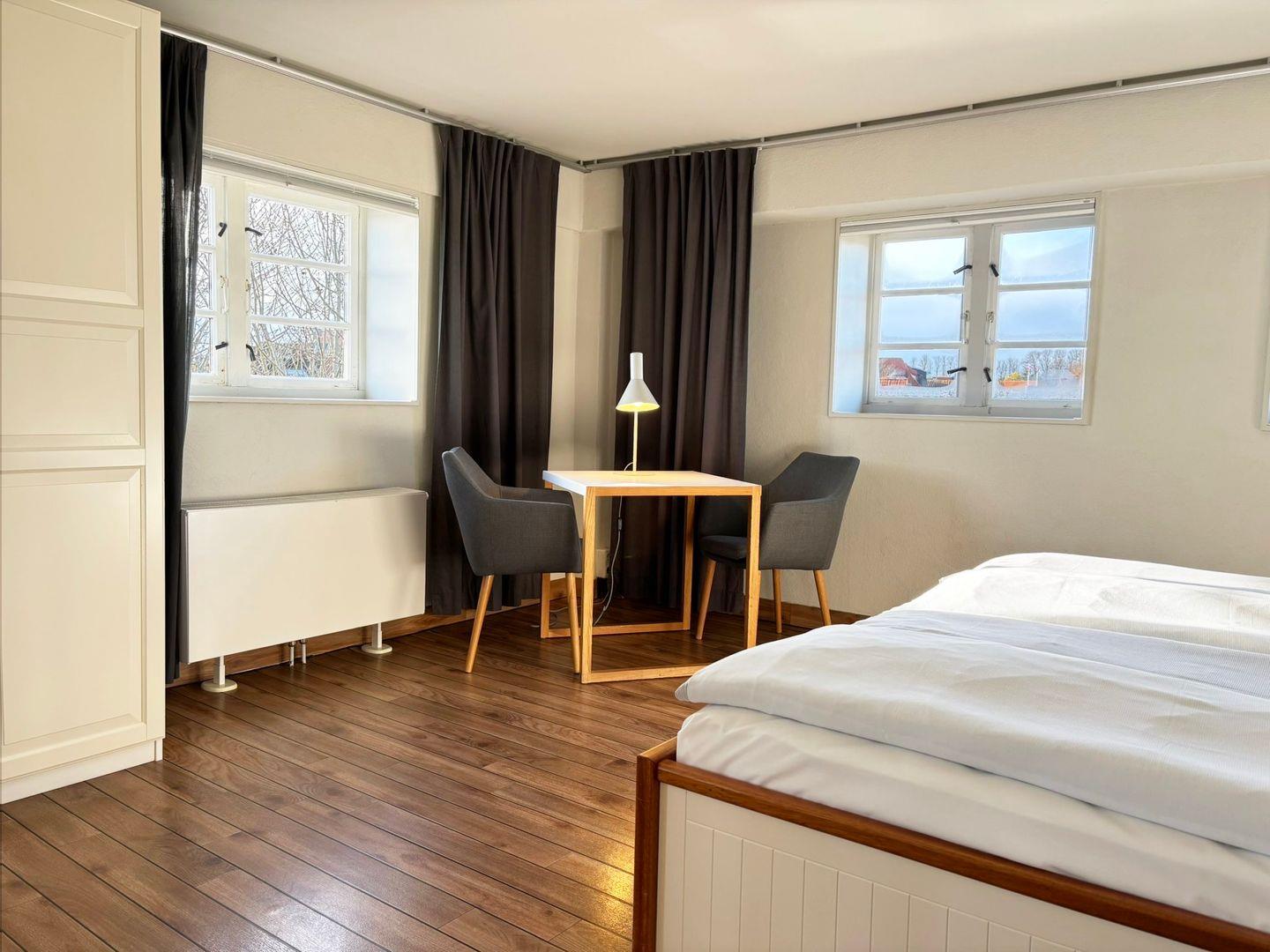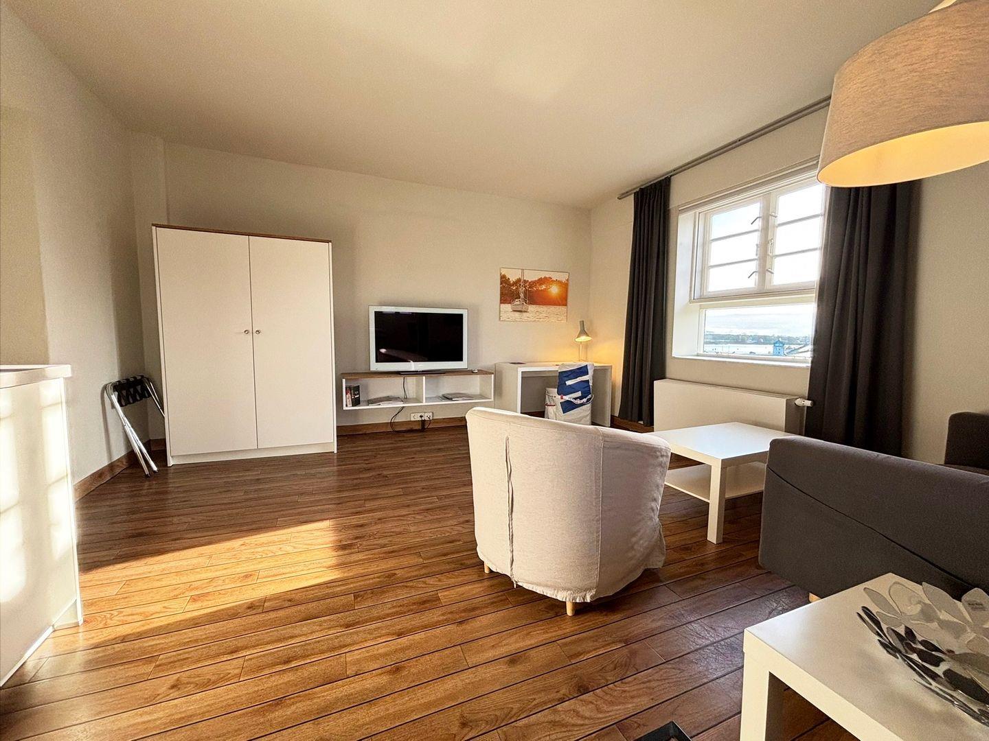 Das Appartement liegt in der vierten Etage des Pierspeichers und ist bequem über einen Aufzug oder das Treppenhaus erreichbar. Der offene Wohnbereich ist mit einem Esstisch, Sessel sowie einem Sofa und einem TV-Gerät ausgestattet. Der Schlafbereich verfügt über ein komfortables Doppelbett (180x200 cm) mit getrennten Matratzen und offenem Fußende, ergänzt durch einen Kleiderschrank, Kofferablage und Verdunklungsmöglichkeiten für erholsame Nächte.