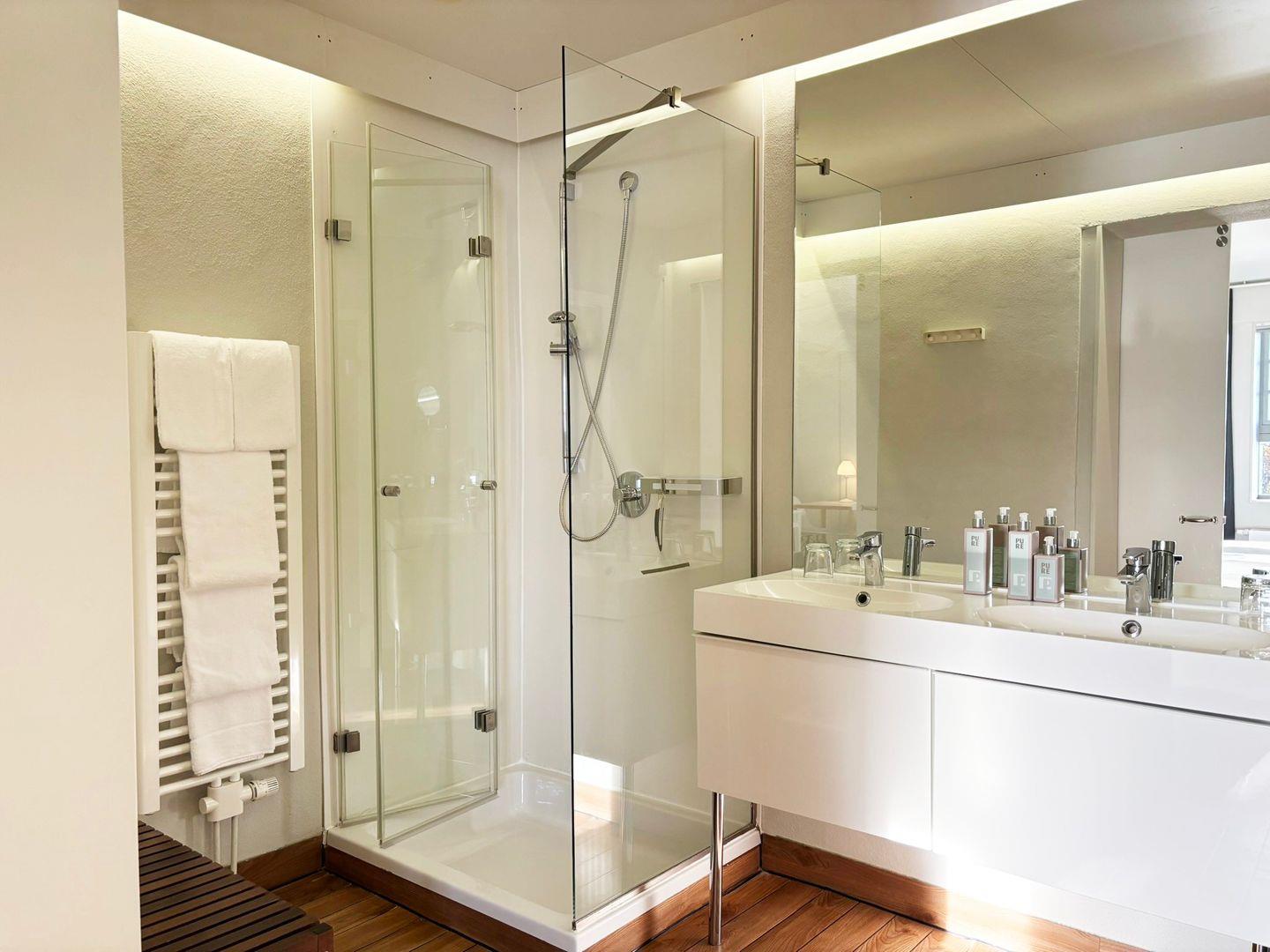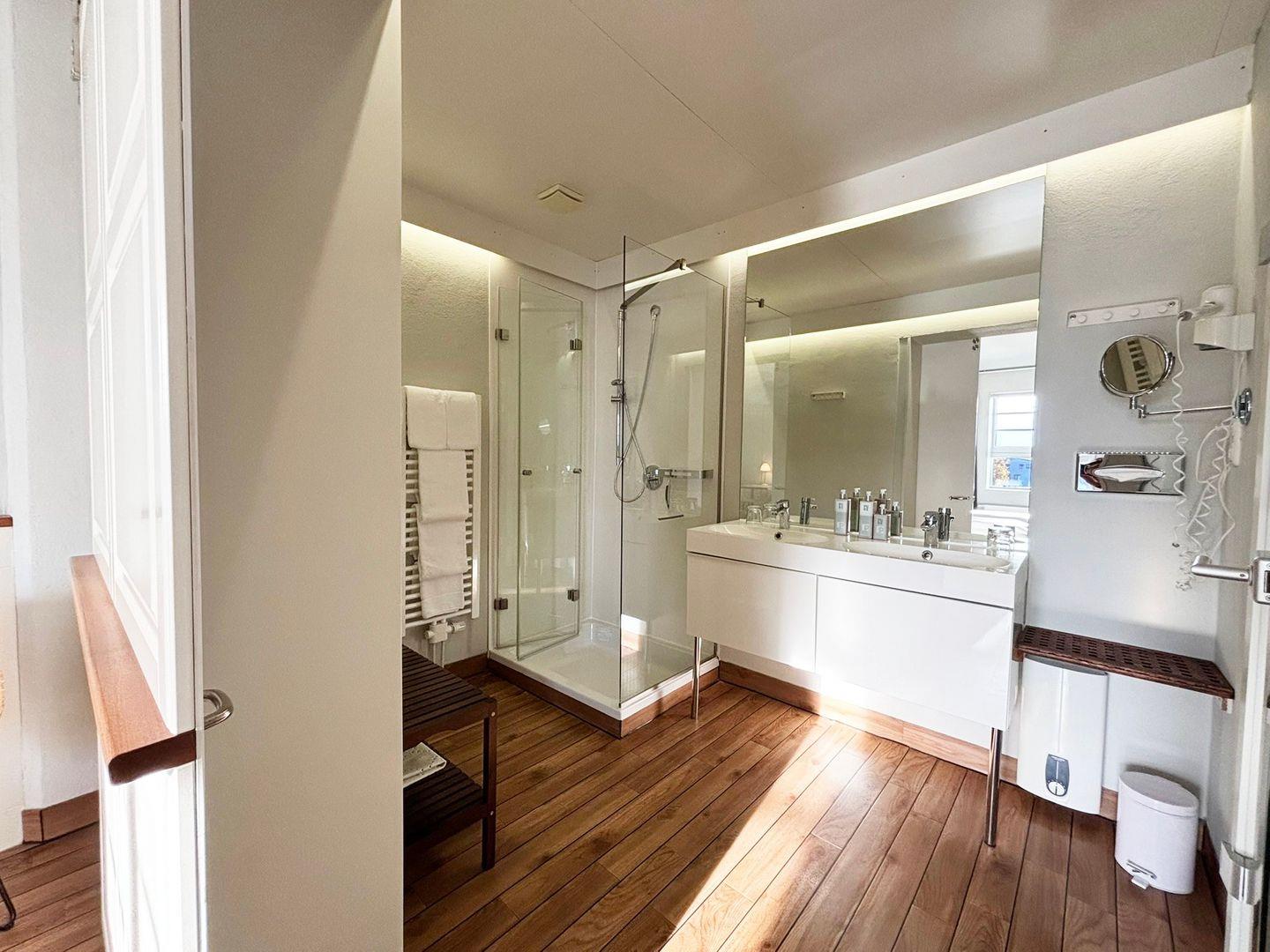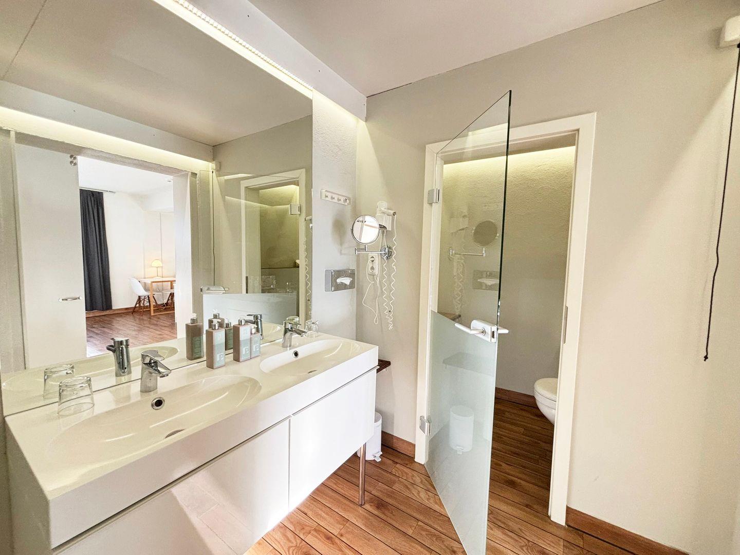 Das Badezimmer ist funktional in zwei separate Bereiche aufgeteilt: In einem Bereich finden Sie das WC, während der andere Bereich mit einer Dusche, Haartrockner, Kosmetikspiegel, Spiegel und einem Waschbecken ausgestattet ist.