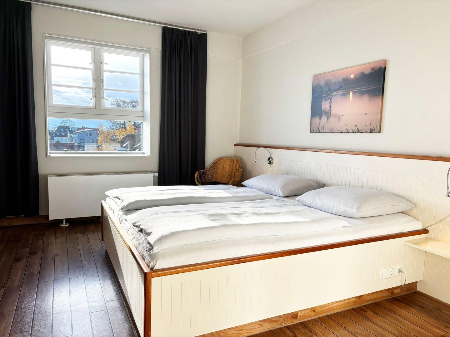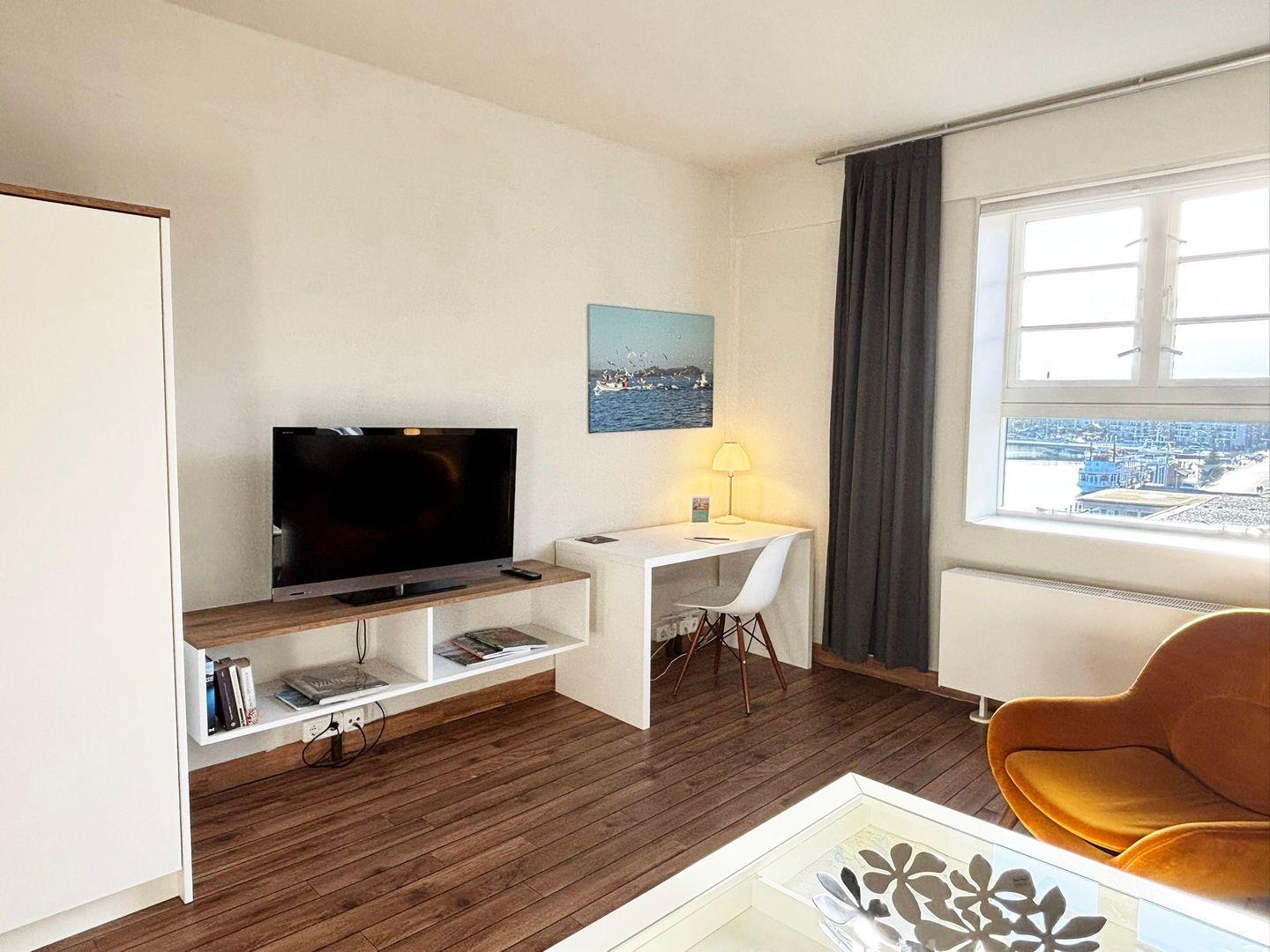 Das Appartement liegt in der vierten Etage des Pierspeichers und ist bequem über einen Aufzug oder das Treppenhaus erreichbar. Der offene Wohnbereich ist mit einem Esstisch, Sessel sowie einem Sofa und einem TV-Gerät ausgestattet. Der Schlafbereich verfügt über ein komfortables Doppelbett (180x200 cm) mit getrennten Matratzen und offenem Fußende, ergänzt durch einen Kleiderschrank, Kofferablage und Verdunklungsmöglichkeiten für erholsame Nächte.