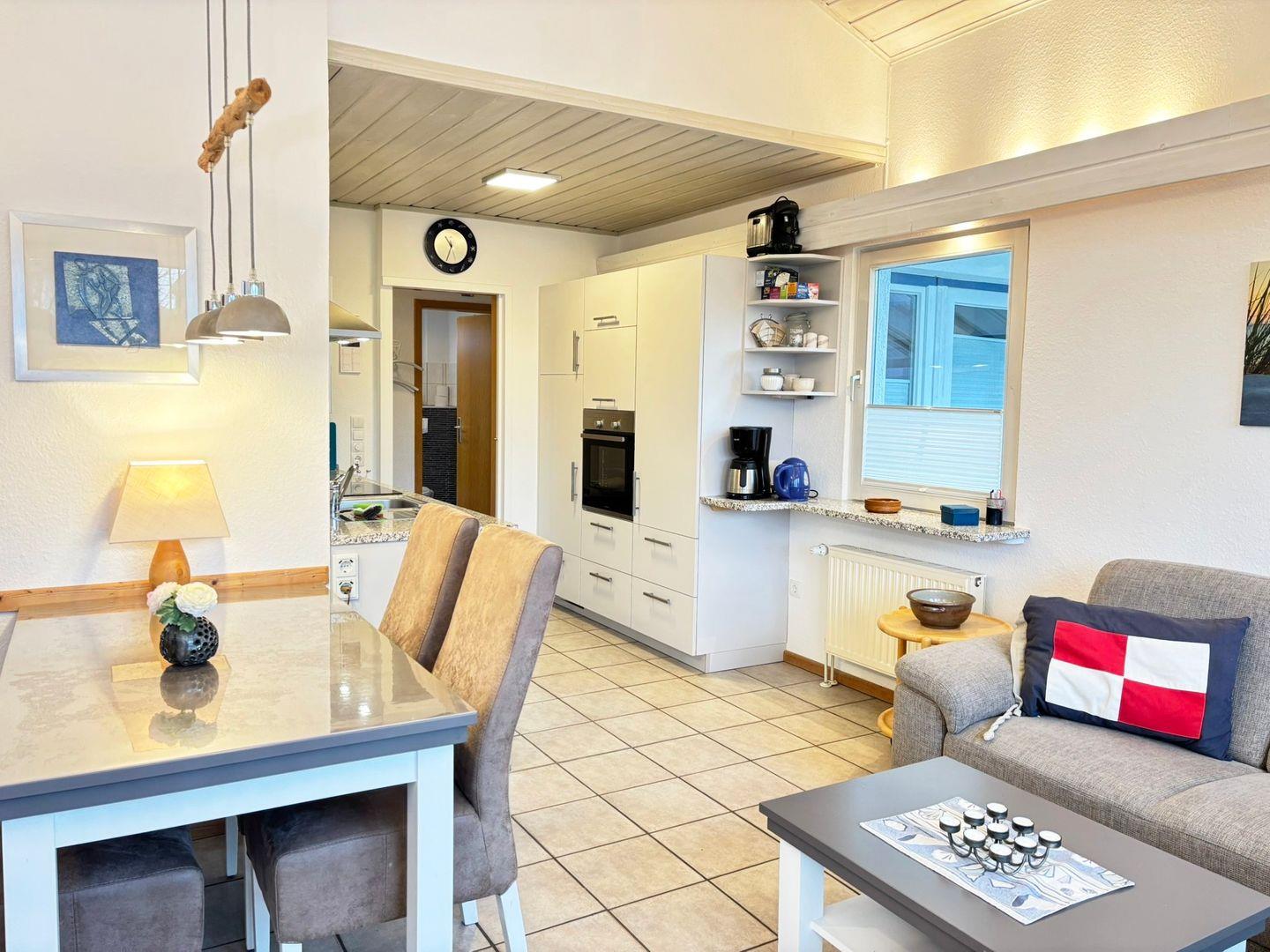 Die voll ausgestattete Küche enthält einen Herd, einen Backofen, eine Mikrowelle, einen Kühlschrank mit Gefrierfach sowie moderne Geräte wie eine Espressomaschine und eine Spülmaschine. Der große Esstisch bietet Platz für bis zu vier Personen, ein fünfter Stuhl kann dazugestellt werden.