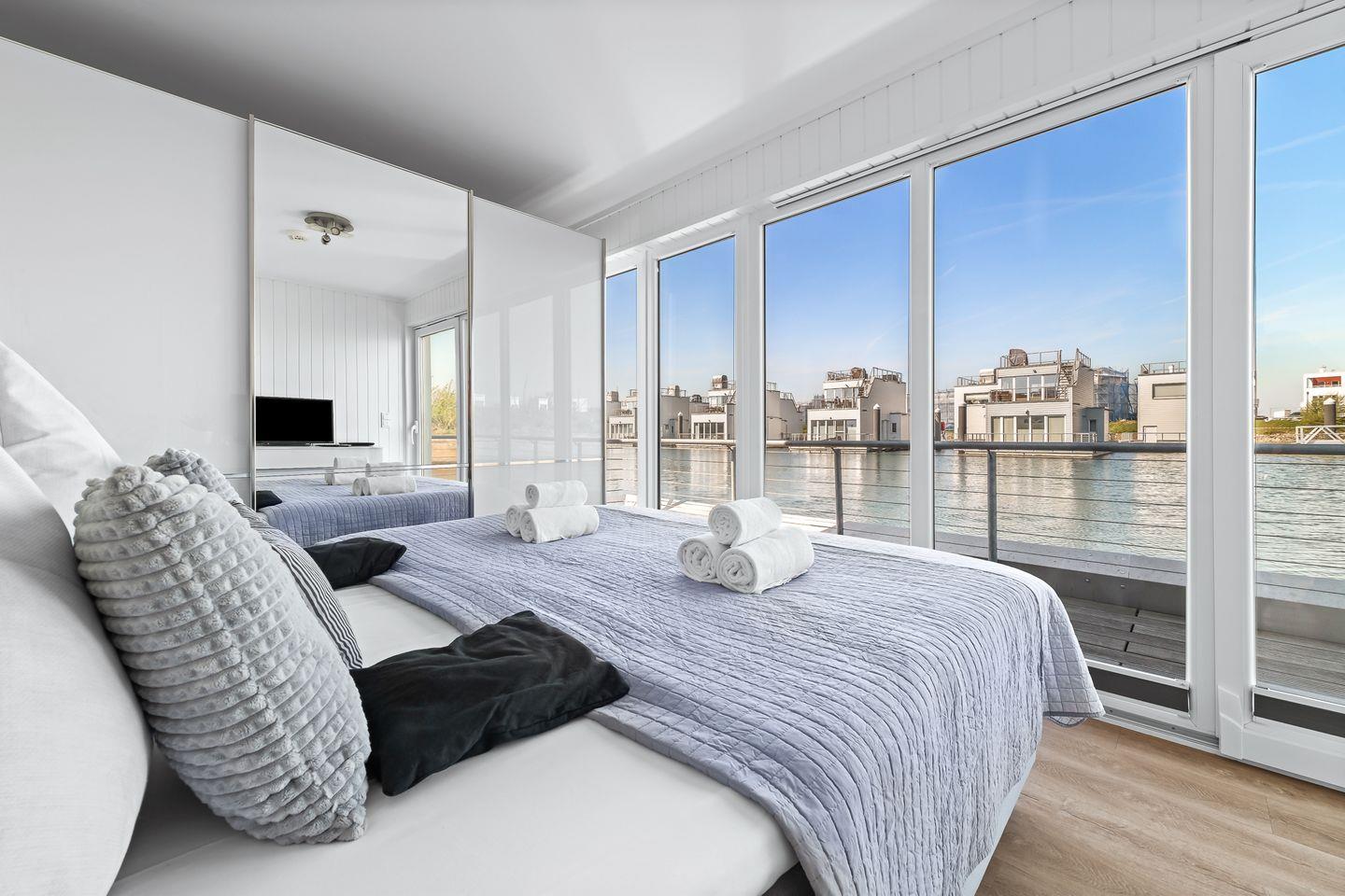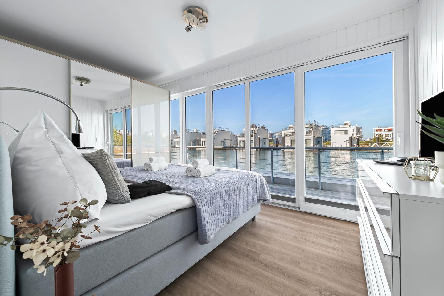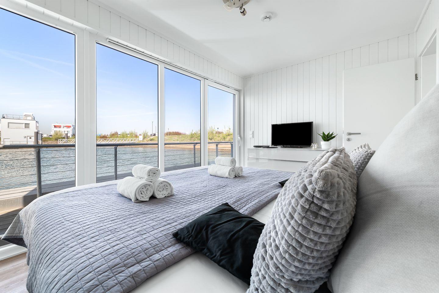 Ruhe und Komfort auf dem Wasser: Das Wasserhaus "Natea", ein Ort der Entspannung, erstreckt sich über zwei Etagen. Im Erdgeschoss befinden sich zwei Schlafzimmer: Der Hauptschlafraum bietet ein gemütliches Boxspringbett, einen großen Kleiderschrank und einen Fernseher. Eine große Glasfront eröffnet den Blick und Zugang zur Terrasse direkt am Wasser. Das zweite Schlafzimmer verfügt über zwei komfortable 90 cm-Betten, einen Schrank und ebenfalls einen Fernseher. Eine kleine finnische Sauna und ein modernes Duschbad runden die Ausstattung ab.
