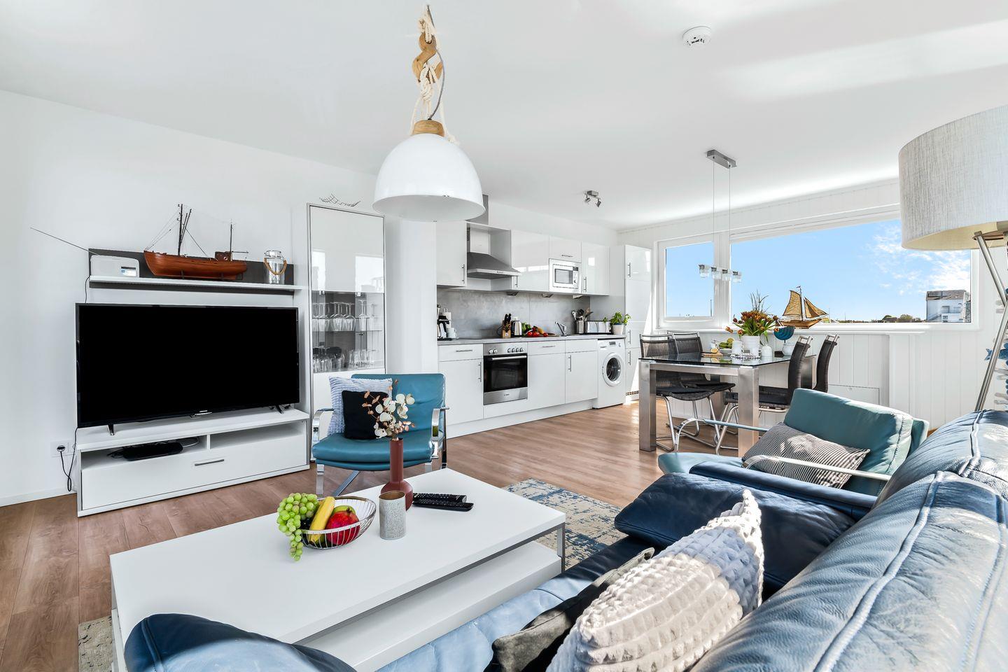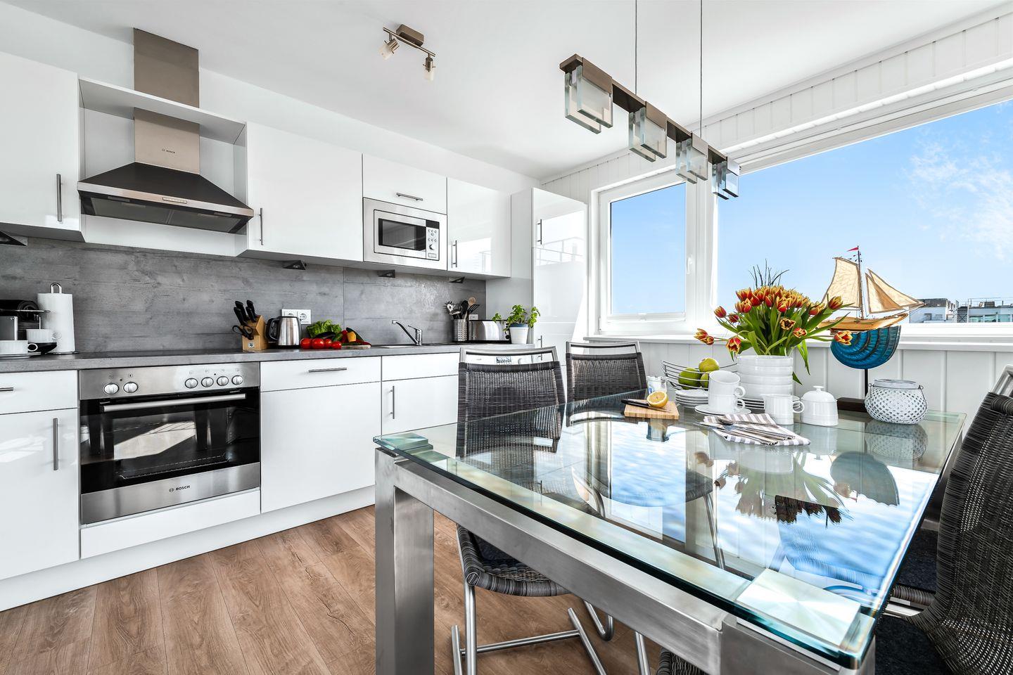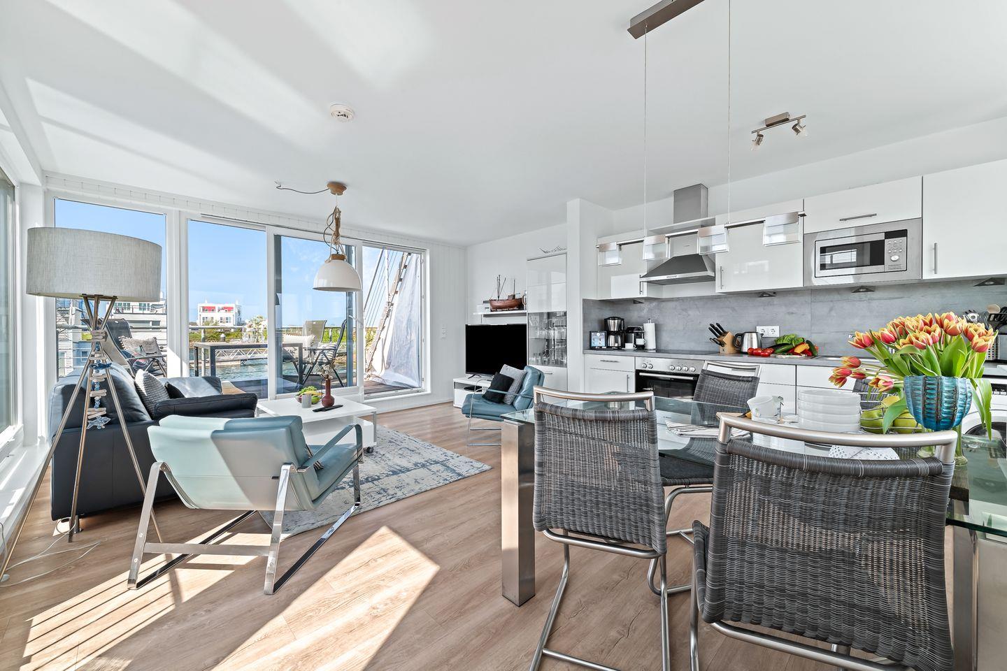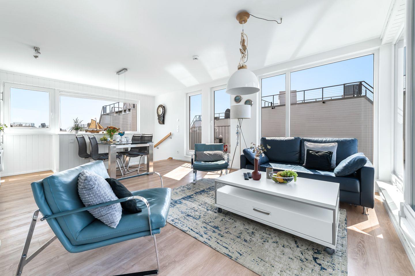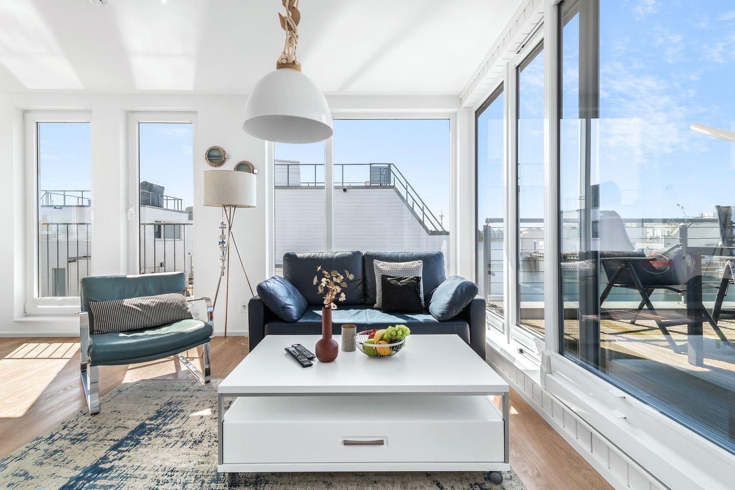 Stilvolles Ambiente mit spektakulärer Aussicht: Im Obergeschoss erwartet Sie ein großzügiger Wohn- und Essbereich mit integrierter, modern ausgestatteter Küche. Große Panoramafenster führen auf einen großzügigen Balkon mit komfortablen Outdoor-Möbeln - ideal für entspannte Momente über dem Wasser. Die große Dachterrasse mit zusätzlichen Lounge-Möbeln bietet einen ungestörten Ausblick auf das Meer und die umliegende Natur.