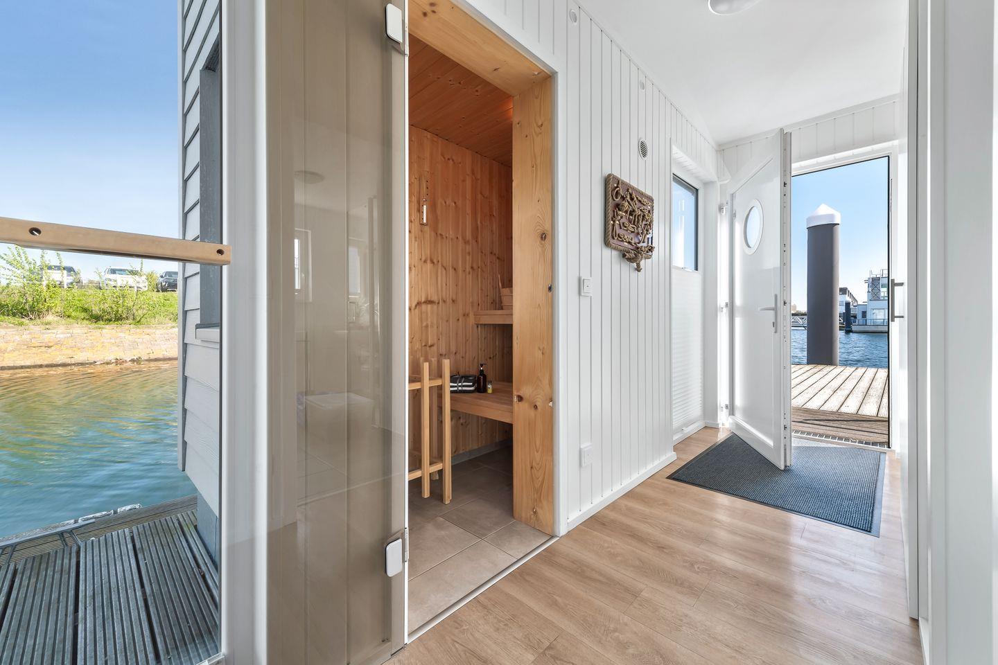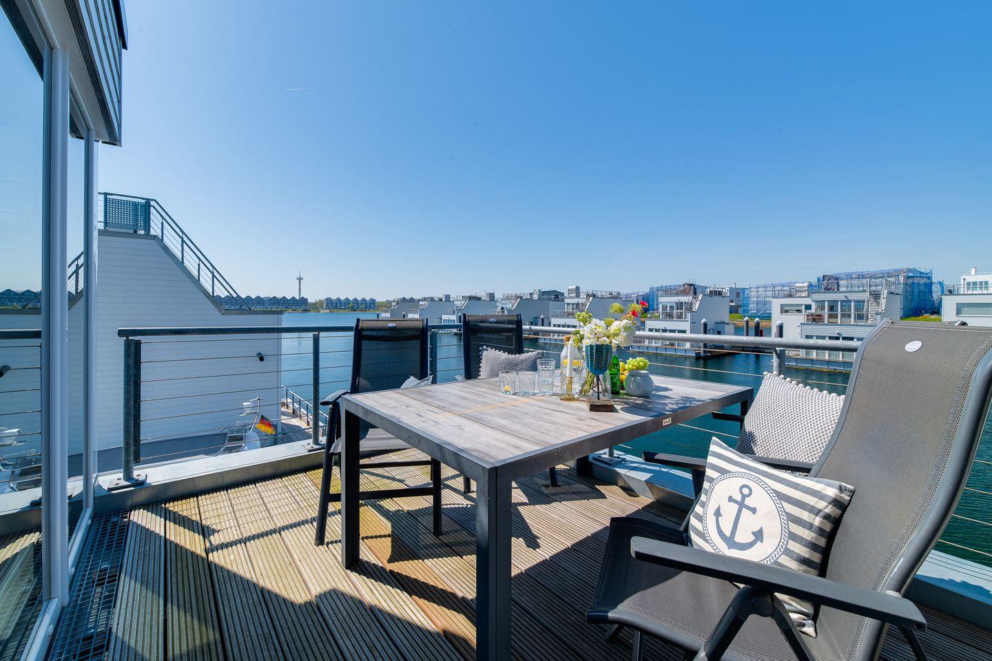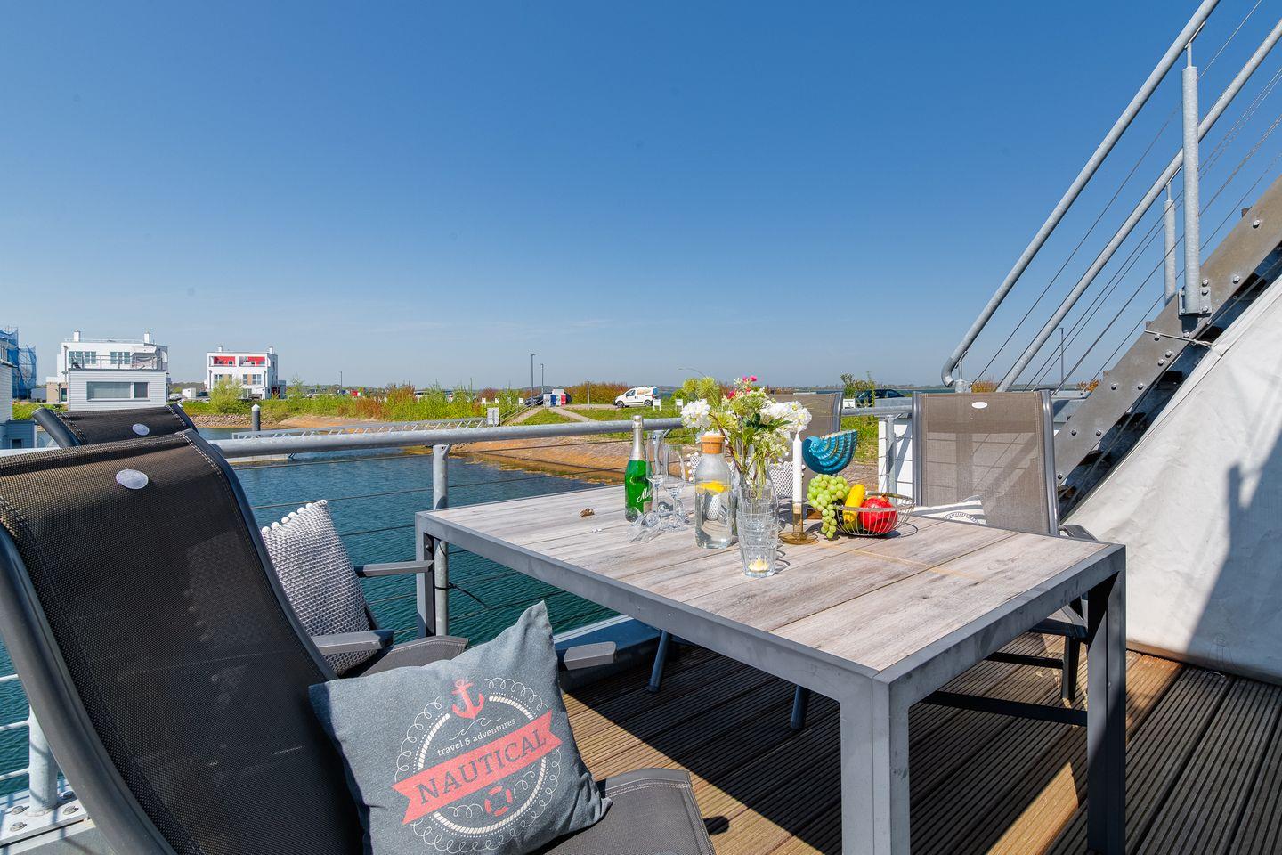 Erleben Sie Ostseeurlaub im schwimmenden Wasserhaus Natea mit Sauna, Sonnendeck und herrlichem Meerblick.