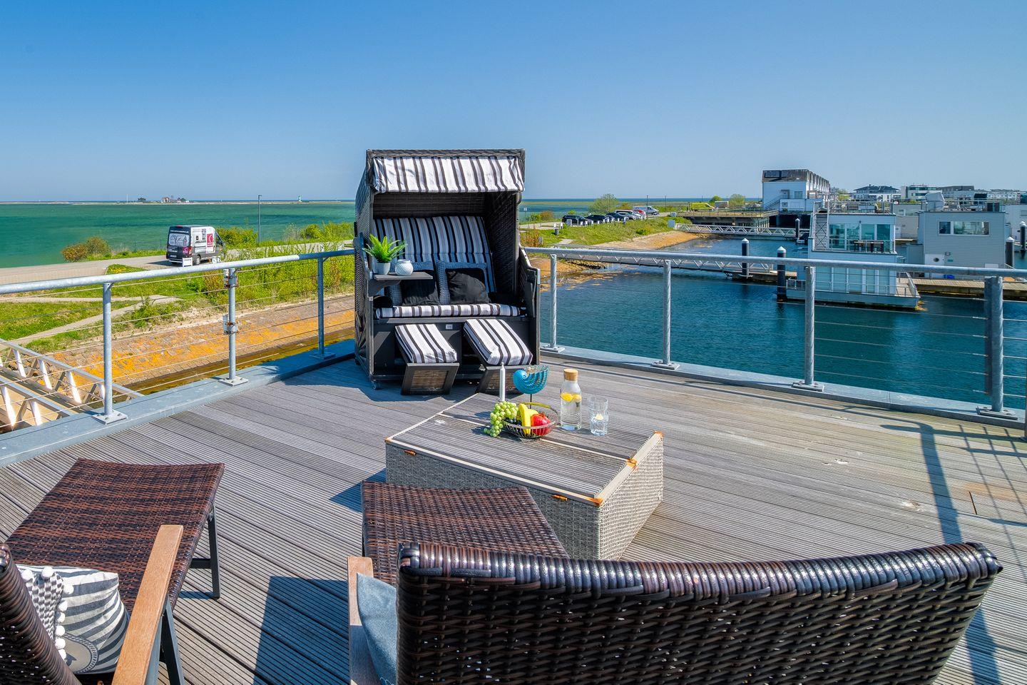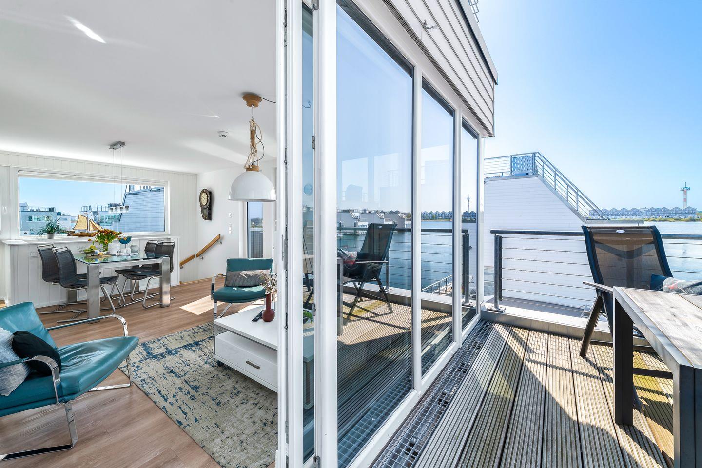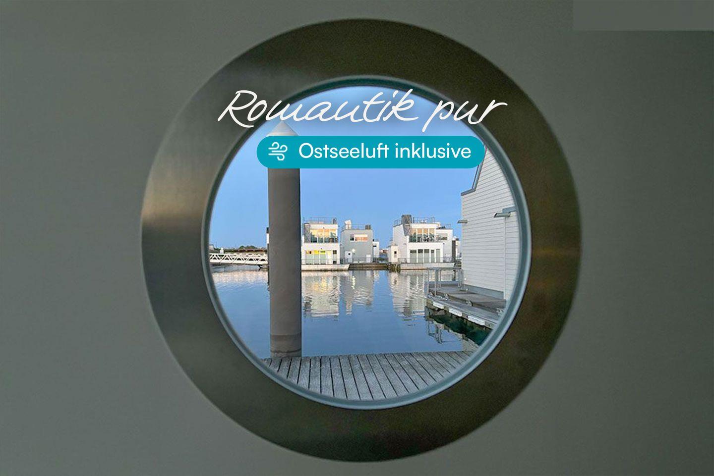 Erleben Sie Ostseeurlaub im schwimmenden Wasserhaus Natea mit Sauna, Sonnendeck und herrlichem Meerblick.
