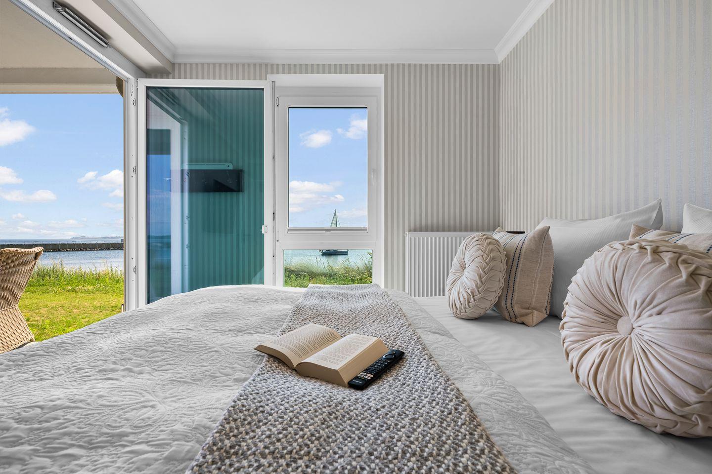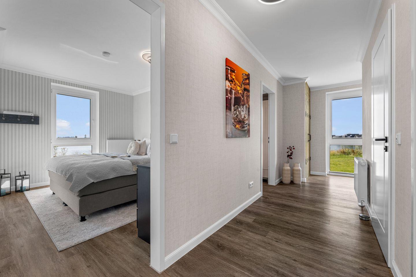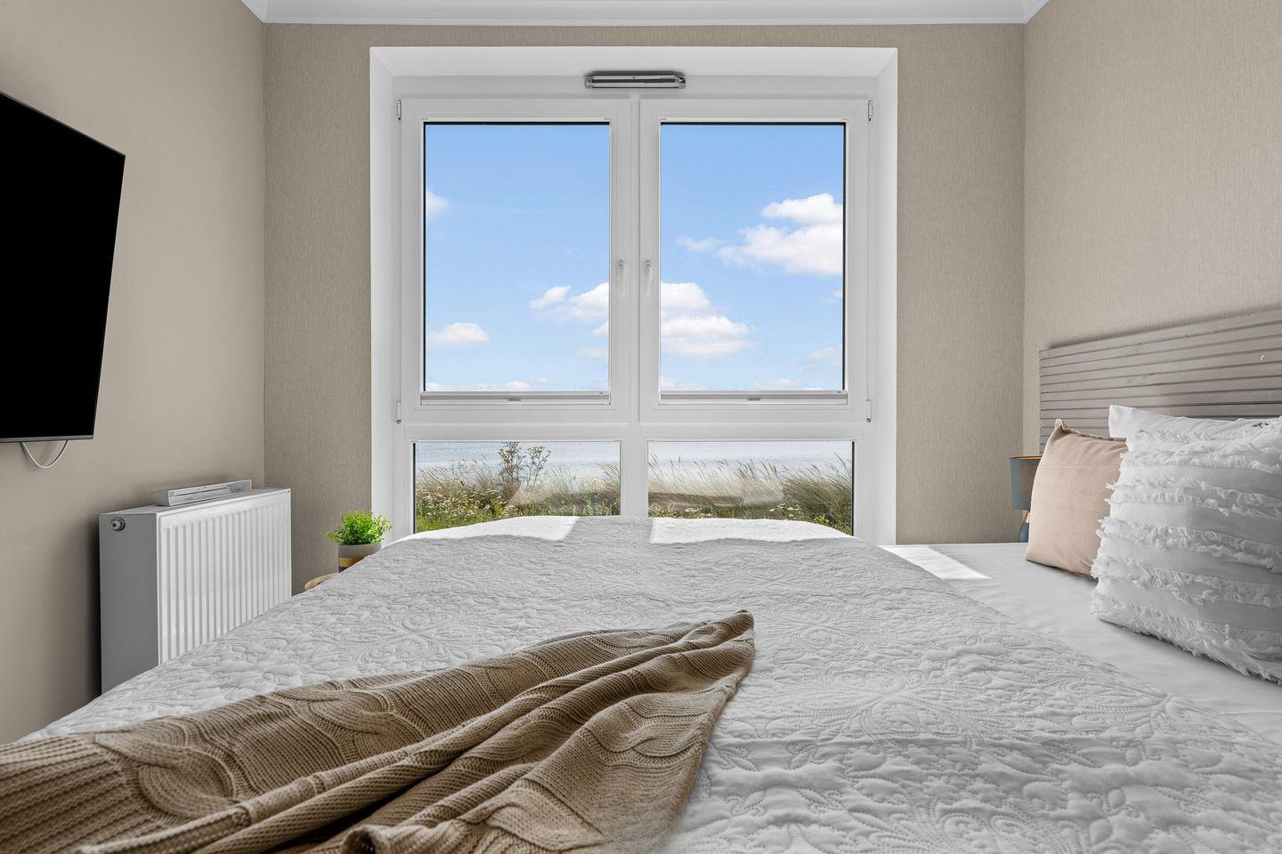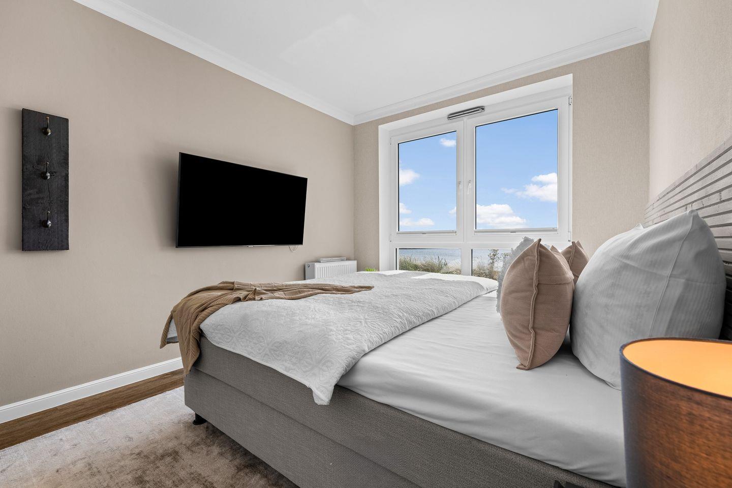 Im Wohnzimmer laden ein komfortables Dreier- und ein Zweiersofa sowie ein variabler Couchtisch zum Relaxen ein, während ein Flat-Screen-TV für Unterhaltung sorgt. Zwei Schlafzimmer mit jeweils einem großen Boxspringbett versprechen erholsame Nächte. Bodentiefe Fenster gewähren auch hier einen herrlichen Meerblick und lassen sich mit praktischen Plissees verdunkeln, falls gewünscht.
