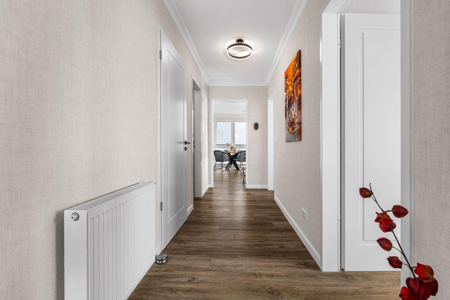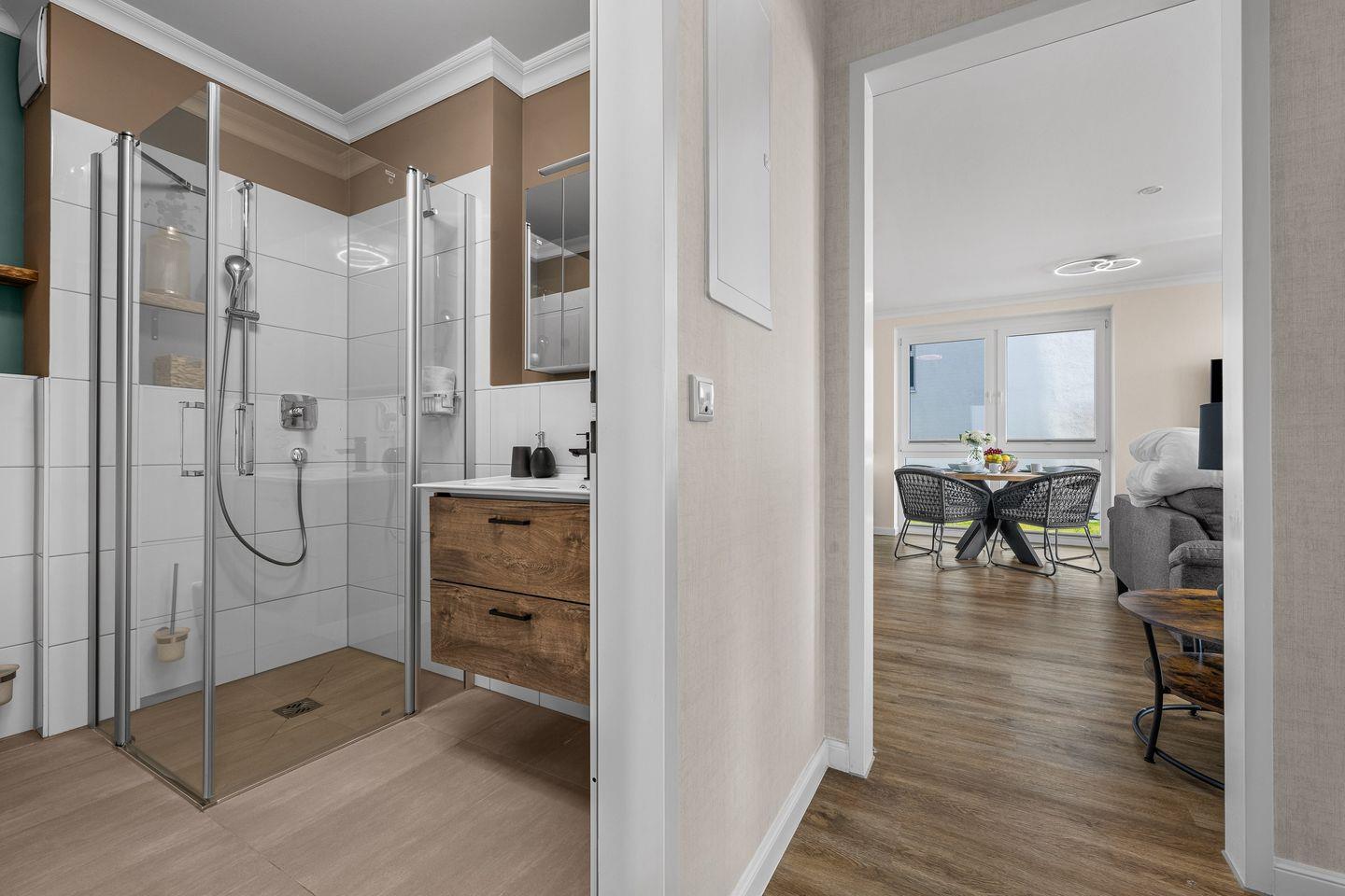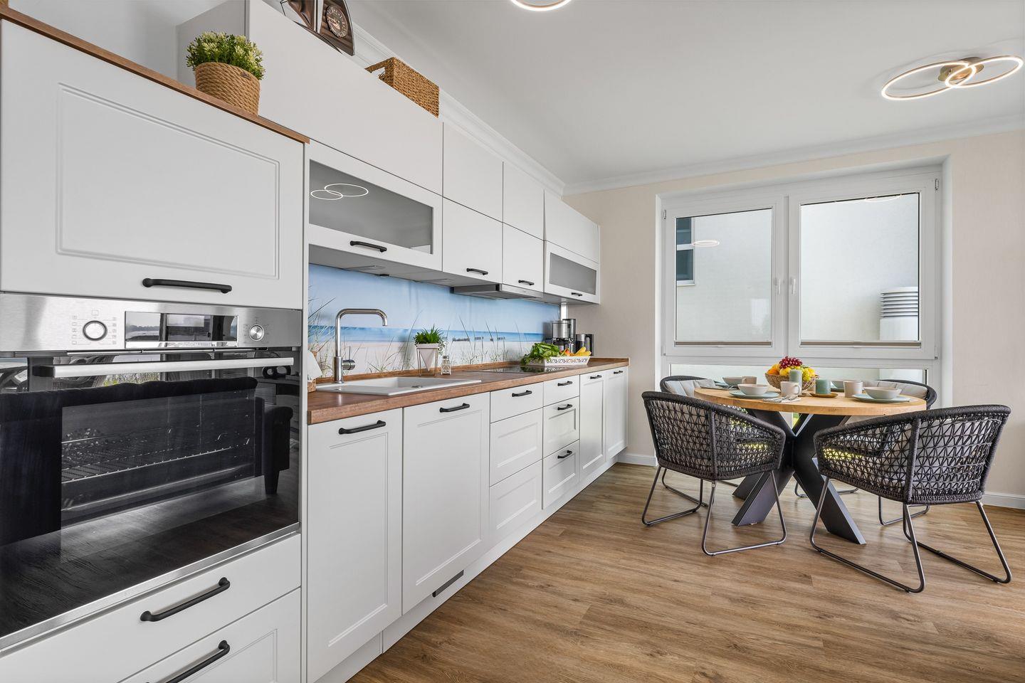 Beim Betreten empfängt Sie ein großzügiger Eingangsbereich mit Garderobe, Sitzbank und geräumigem Schrank. Von hier aus gelangen Sie in alle weiteren Räume der Wohnung. Der Wohnbereich überzeugt mit einem offenen Konzept, der einen Einklang von Wohnen, Essen und Entspannung schafft. Die moderne, voll ausgestattete Einbauküche, inklusive Induktionskochfeld und allen wichtigen Dingen wie Kaffeemaschine, Wasserkocher und Geschirrspüler, lädt Hobbyköche zum gemeinsamen Kochen ein.