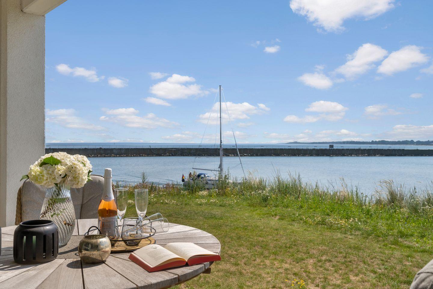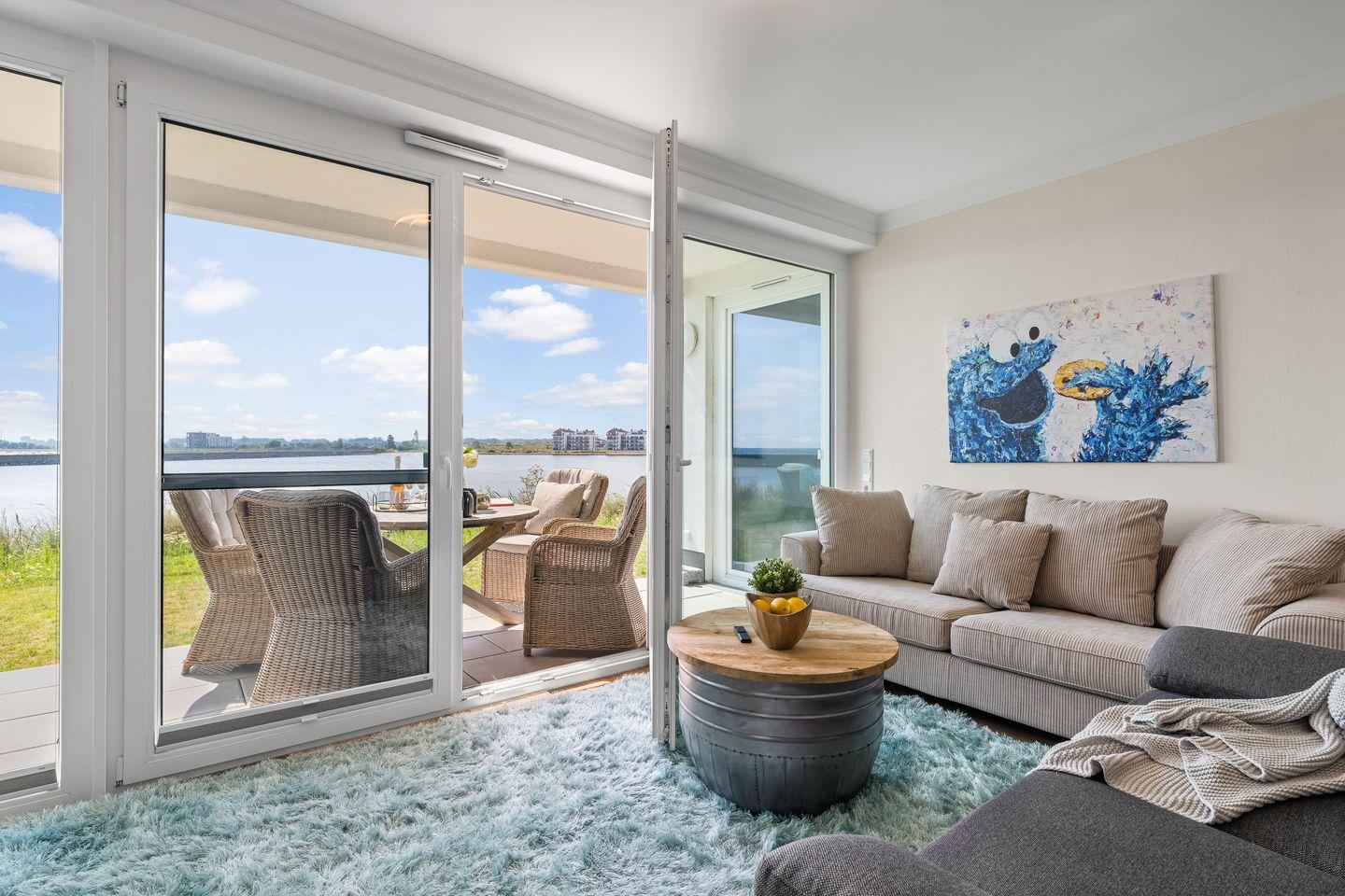 Die überdachte Terrasse ist gemütlich mit stylischen Loungemöbeln eingerichtet und bietet einen ungestörten Weitblick auf die Ostsee, den Hafen und bei guter Sicht bis zum Weidefelder Strand. Beobachten Sie Segelboote, Wildvögel, die wundervolle Natur und lassen Sie den Tag entspannt bei einem Sonnenuntergang ausklingen.