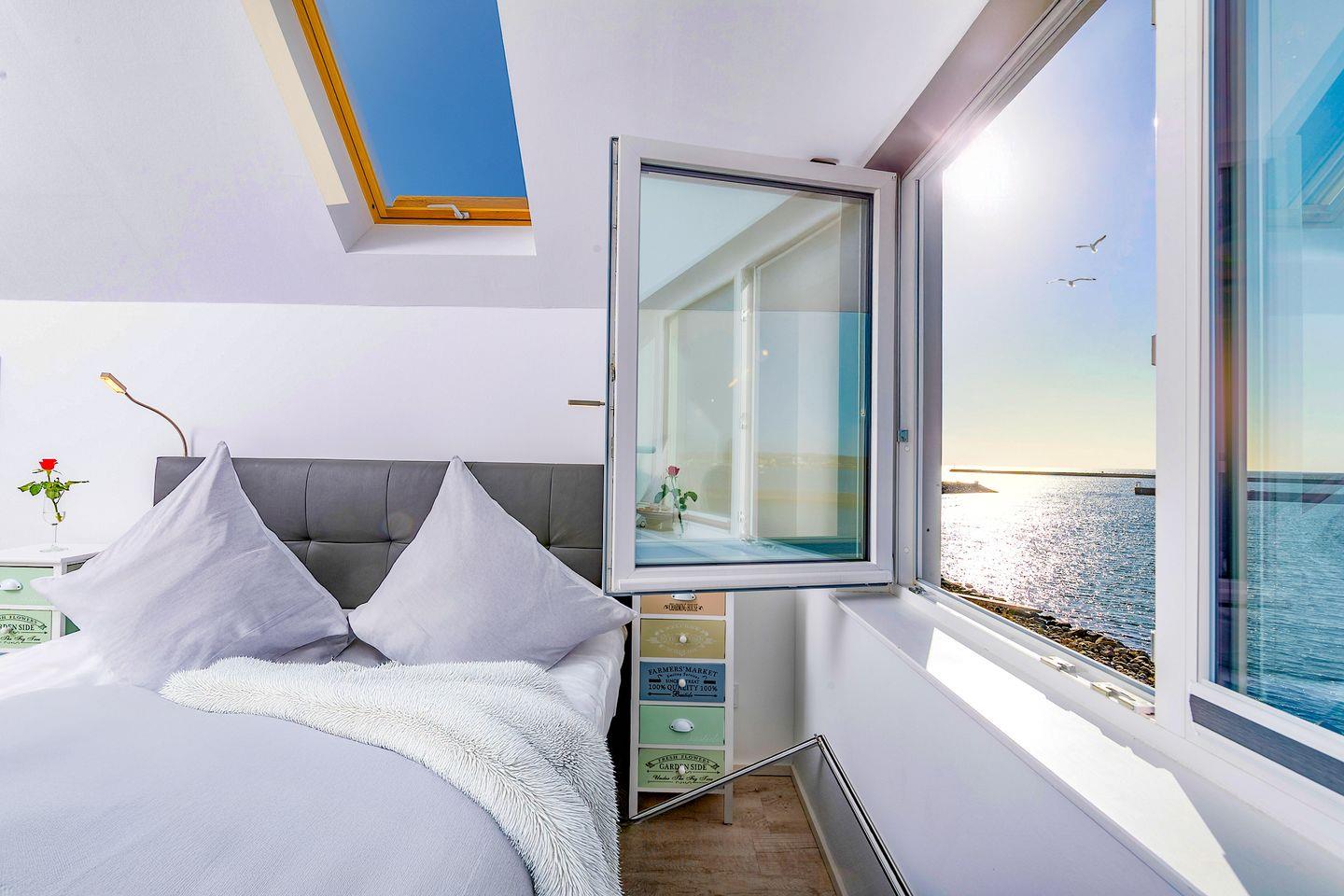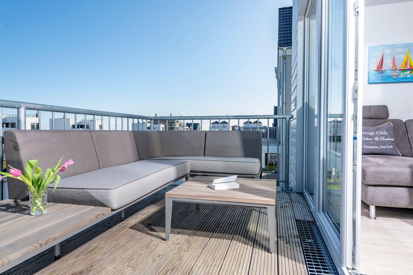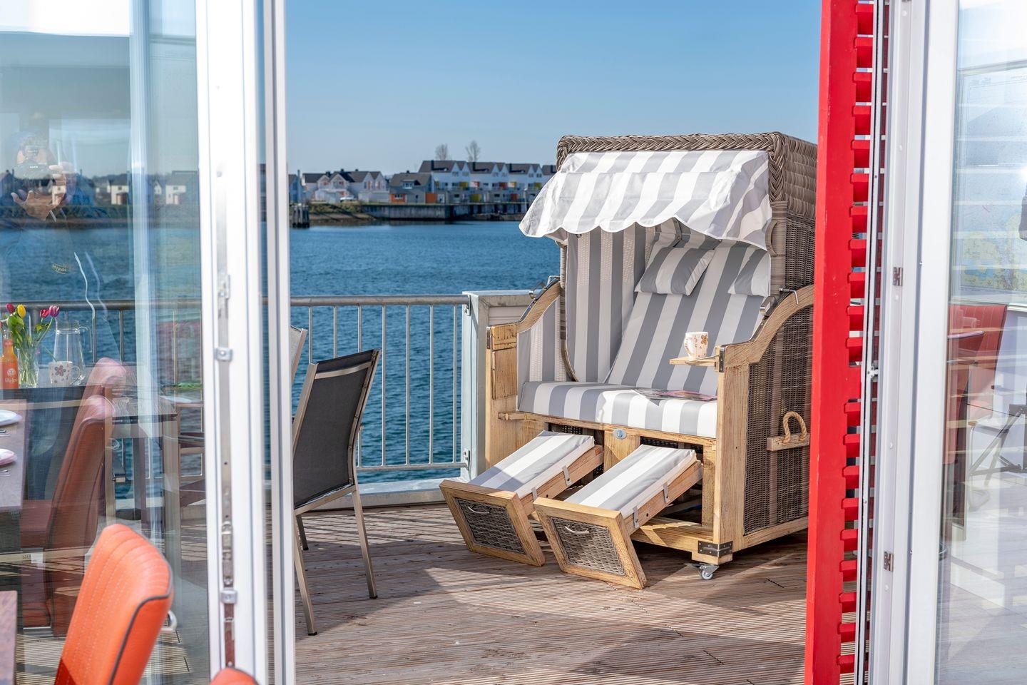 Der Balkon mit direktem Meerblick lädt zu jeder Tageszeit zum Verweilen ein. Sonnenliegen und ein Strandkorb steigern das Urlaubsgefühl.