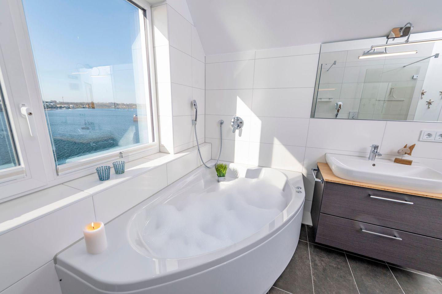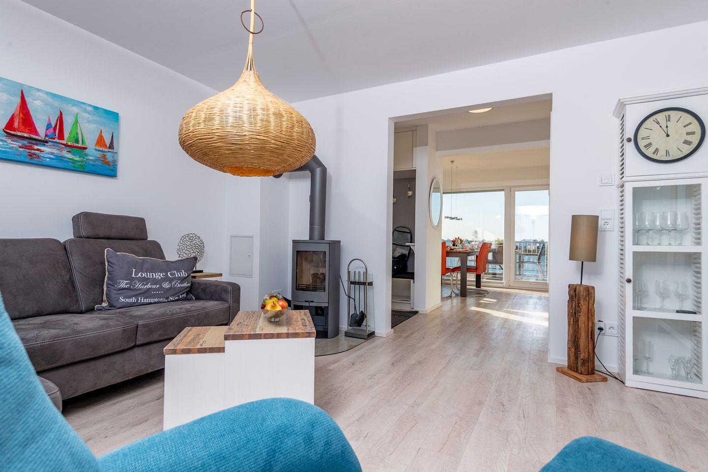 Die Ferienwohnung "Baltic Side" bietet auf 97 m² eine moderne Ausstattung mit zwei Schlafzimmern, Kaminofen, offenem Wohn- und Essbereich sowie einem Balkon mit Meerblick. Der Sandstrand ist in 350 m erreichbar.