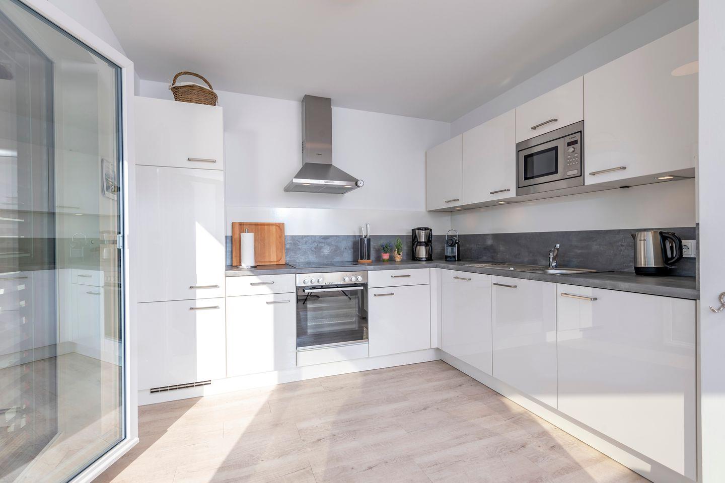 Die offene Küche ist hochwertig ausgestattet – u.?a. mit Cerankochfeld, Backofen, Mikrowelle, Spülmaschine, Nespresso-Espressomaschine sowie Wasserkocher, Toaster und klassischer Kaffeemaschine. Für kulinarische Abende steht zudem ein Elektrogrill bereit.