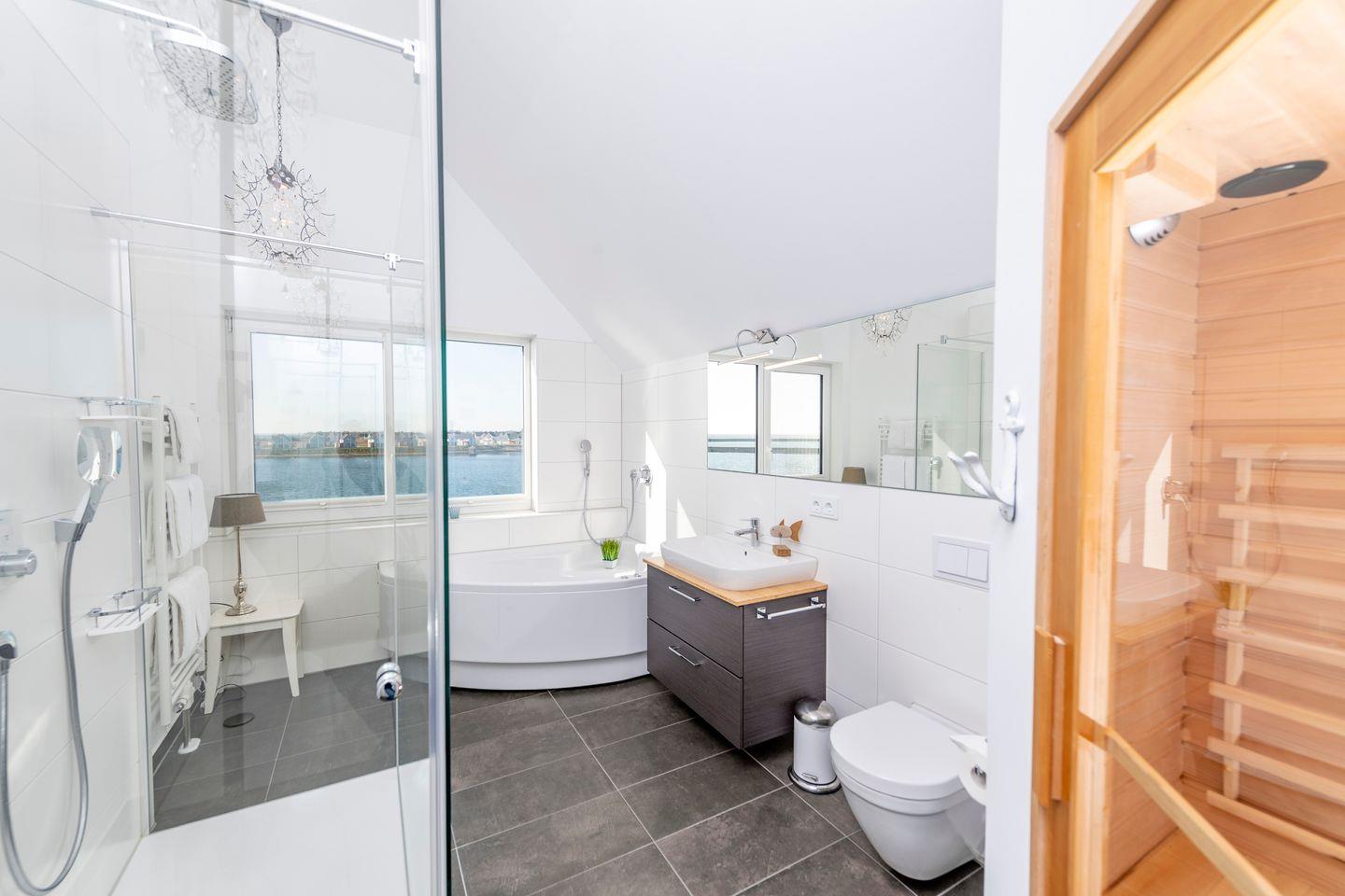 Das stilvolle Badezimmer verfügt über Dusche, Badewanne, WC, Waschbecken und Föhn.