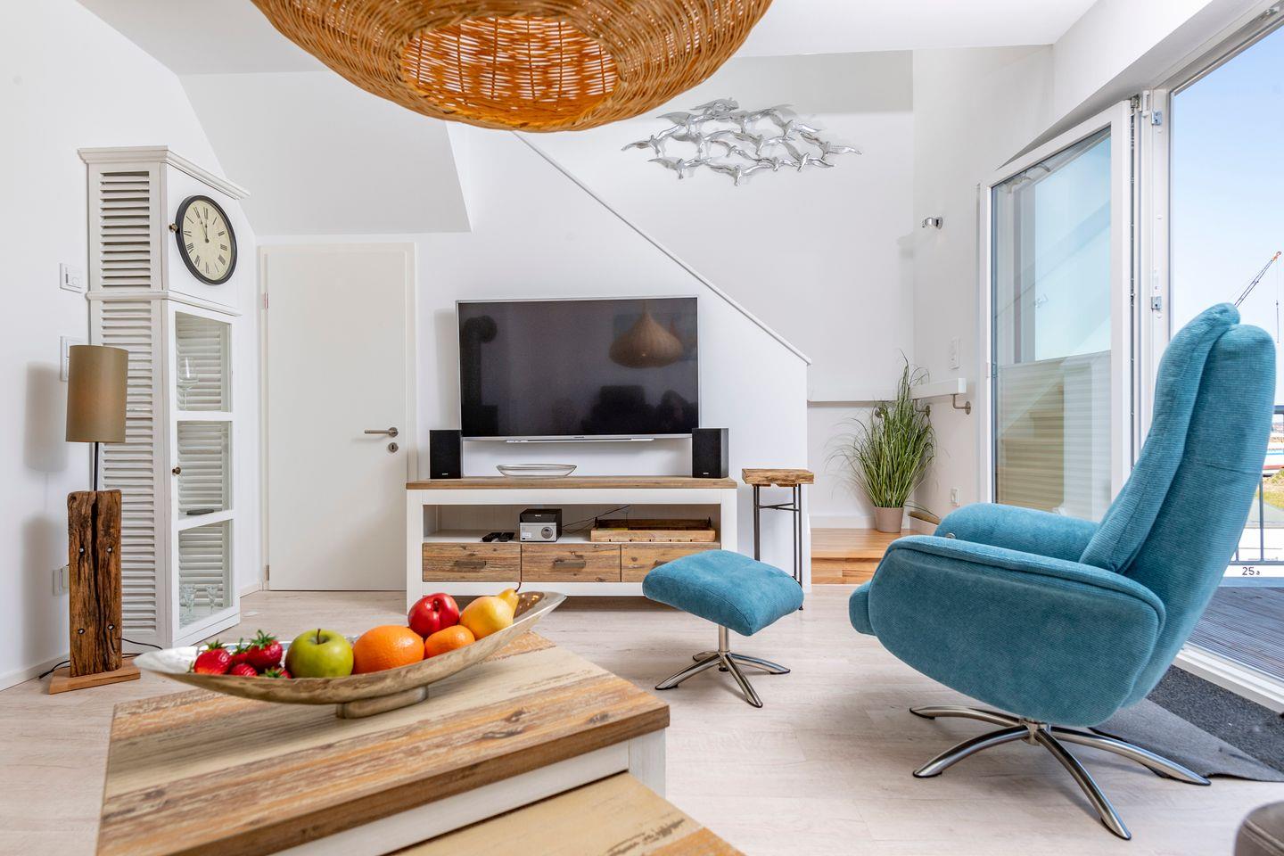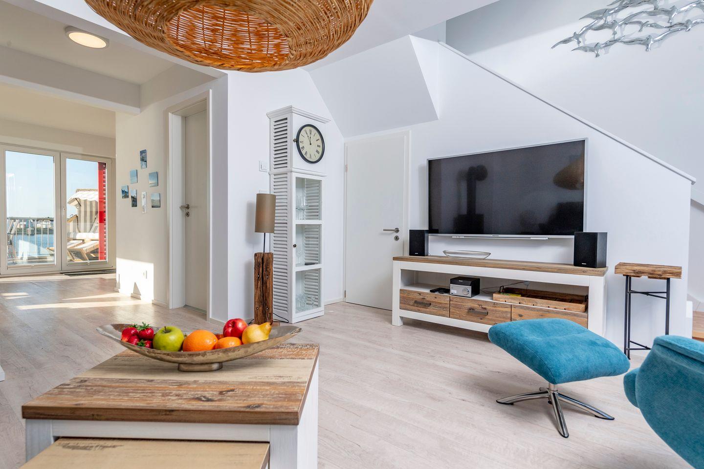 Der Wohn- und Essbereich mit Fußbodenheizung lädt zum Entspannen ein: ein Kaminofen, bequeme Sitzmöbel, Esstisch sowie drei moderne Fernseher sorgen für Gemütlichkeit. Natürlich steht Ihnen auch WLAN kostenfrei zur Verfügung.