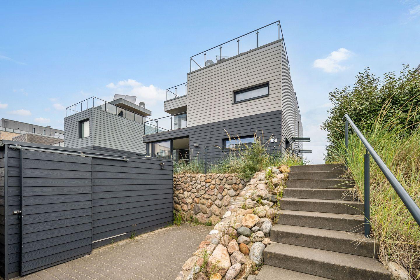Die Dachterrasse ist einer dieser Orte, an denen die Zeit stillzustehen scheint. Zwei Liegestühle, gemütliche Loungemöbel und rundum Blick auf die Ostsee und Marina machen sie zu einem echten Herzstück des Hauses.