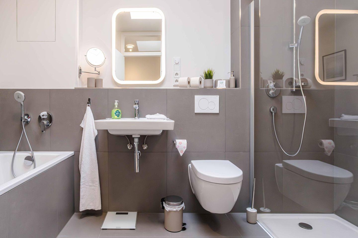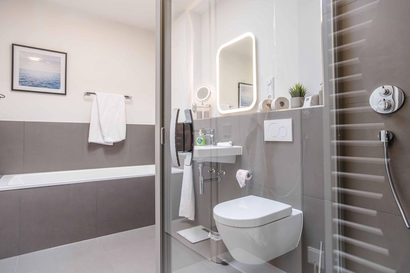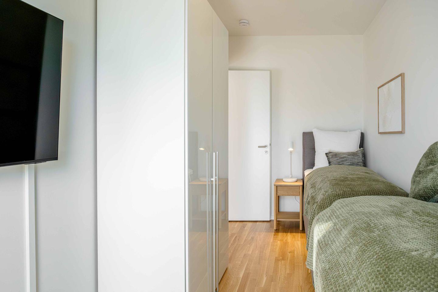 Zwei separate Schlafzimmer sorgen für erholsame Nächte. Das erste Schlafzimmer ist mit einem komfortablen Boxspring-Doppelbett (180x200 cm), einem Kleiderschrank, Verdunklungsmöglichkeiten sowie einem Fernseher ausgestattet. Im zweiten Schlafzimmer befinden sich zwei Einzelbetten (je 90x200 cm), ebenfalls ein Kleiderschrank, ein Fernseher und Verdunklungsmöglichkeiten. Das großzügige Badezimmer verfügt über eine ebenerdige Dusche, eine Badewanne, ein WC, ein Waschbecken, einen Spiegel, einen Haartrockner und wird durch ein Oberlicht angenehm mit Tageslicht versorgt.