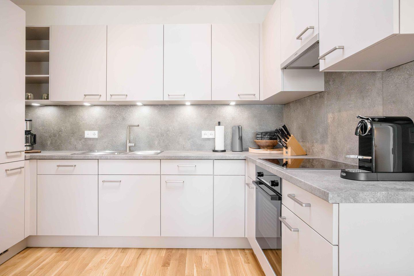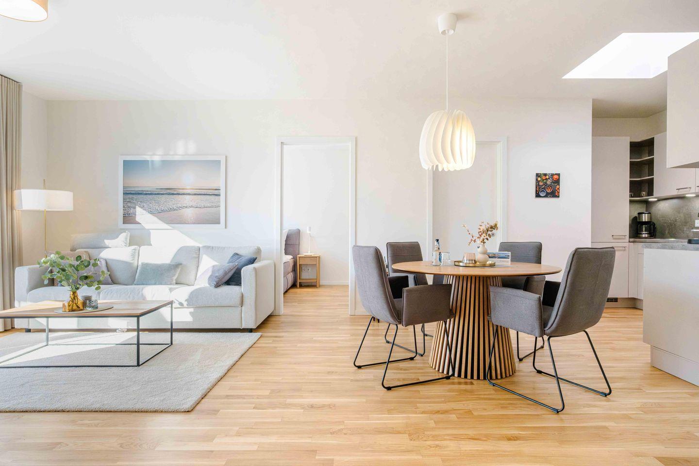 Die Ferienwohnung Spinnaker im Kö8 – Wohnung 19 befindet sich im 1. Obergeschoss und bietet auf ca. 75 m² Wohnfläche ausreichend Platz für bis zu vier Personen. Die modern gestaltete Wohnung verfügt über drei Zimmer und überzeugt mit einem offenen, kombinierten Wohn- und Essbereich, der mit einem gemütlichen Sofa, einem Sessel, einem Esstisch für vier Personen sowie einer Garderobe ausgestattet ist. Die angrenzende, offene Küche lässt keine Wünsche offen und bietet unter anderem ein Induktionskochfeld, einen Backofen, einen Kühlschrank mit Gefriermöglichkeit, eine Spülmaschine, eine Filterkaffeemaschine, eine Nespresso-Maschine, einen Wasserkocher, Toaster sowie ein Handrührgerät.