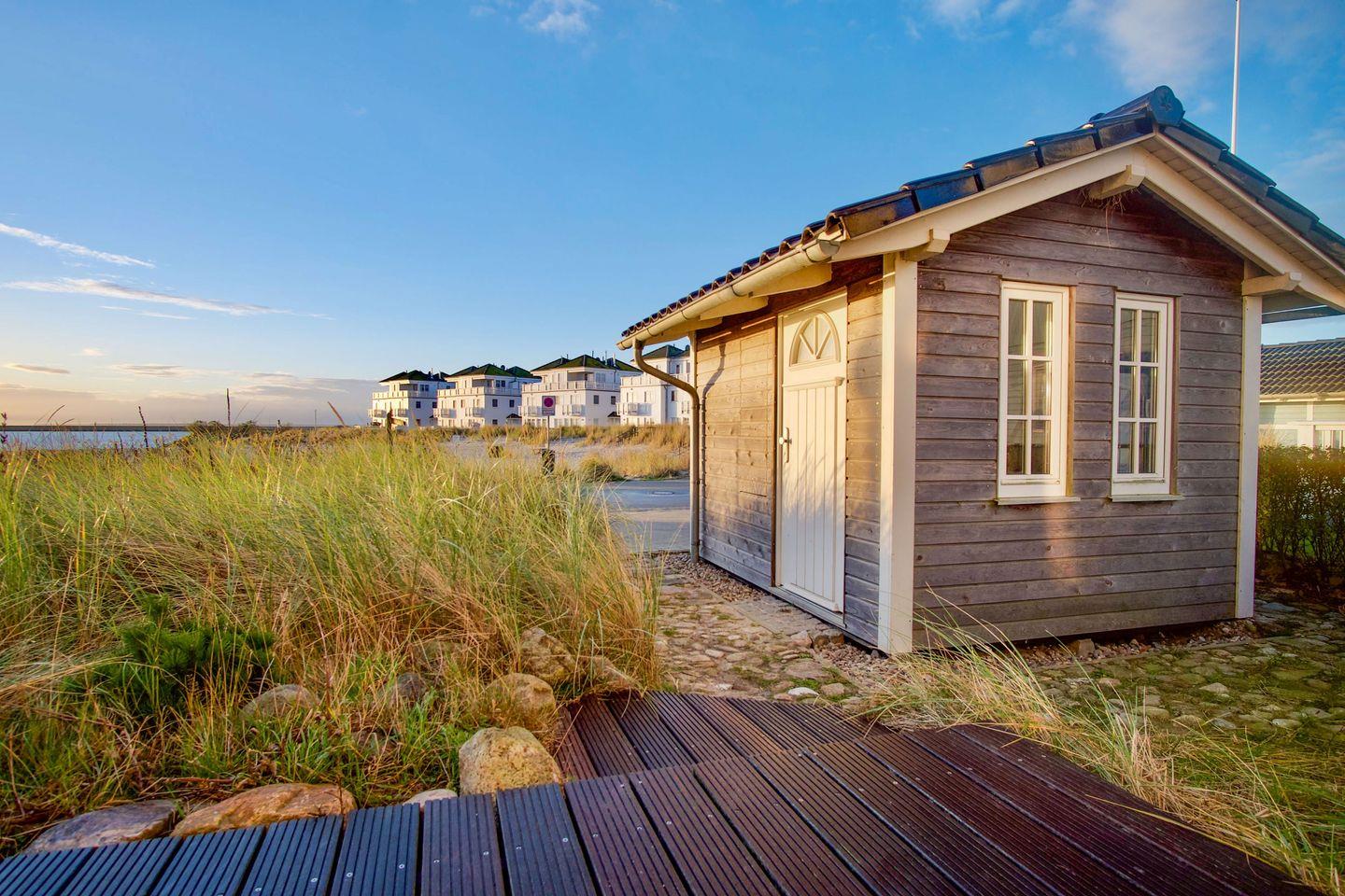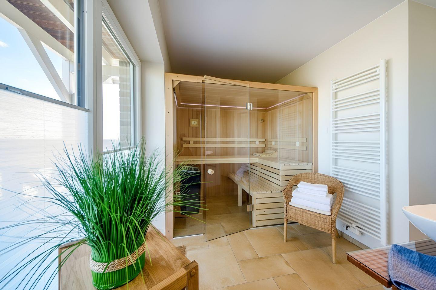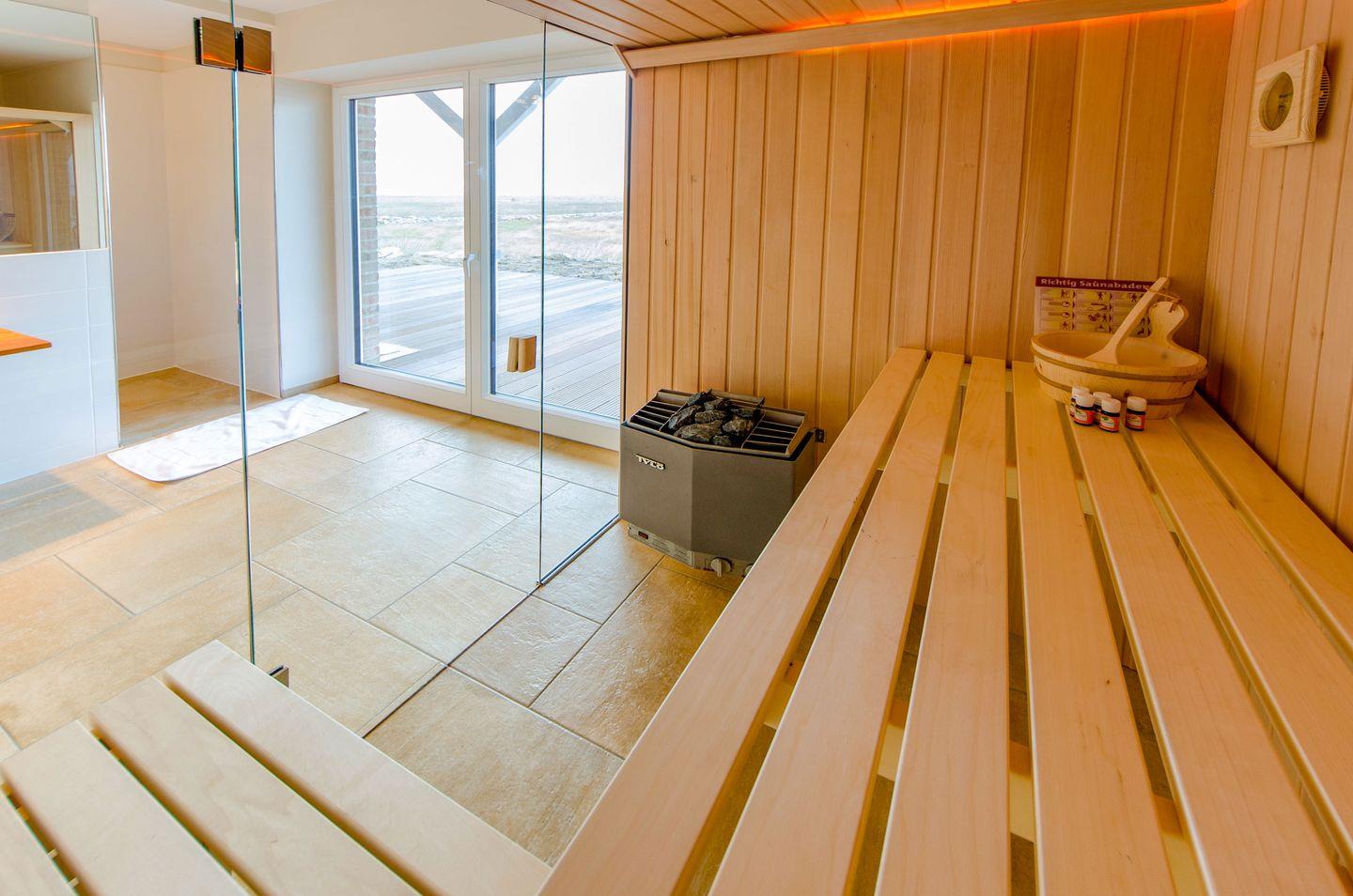 Das Wellnessangebot des Hauses umfasst eine hauseigene Sauna zur exklusiven Eigennutzung – ein Highlight für erholsame Stunden nach einem Strandtag oder sportlicher Betätigung. Im Außenbereich laden eine große Terrasse, ein möblierter Garten, Grill, Gartenhaus sowie zwei Strandkörbe zum Verweilen ein. Der Balkon bietet einen weiteren Rückzugsort mit Blick auf das Meer.