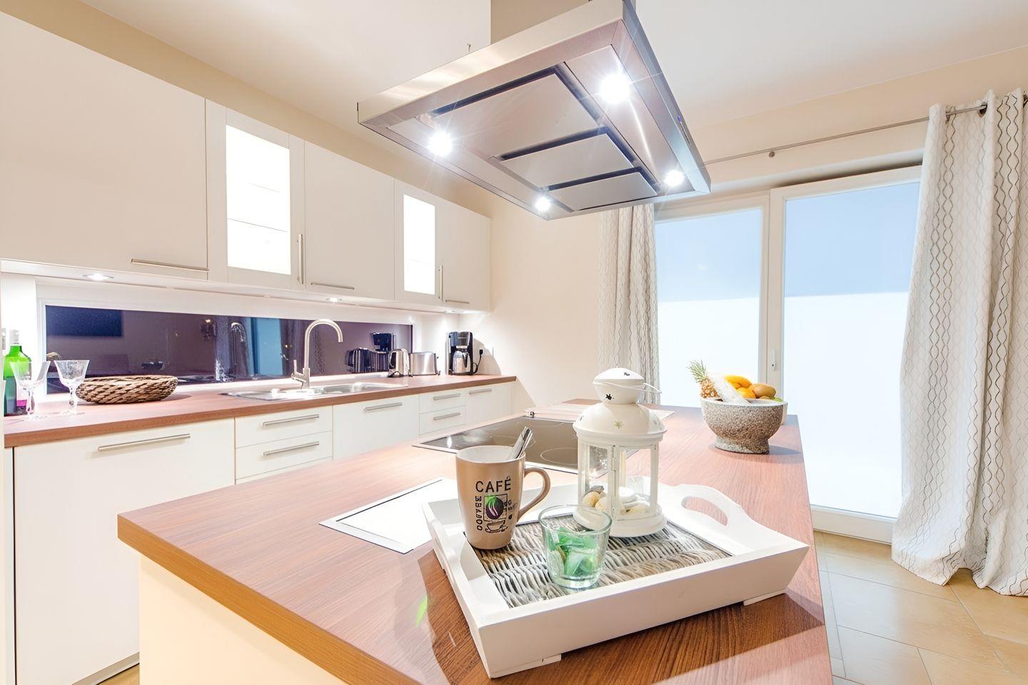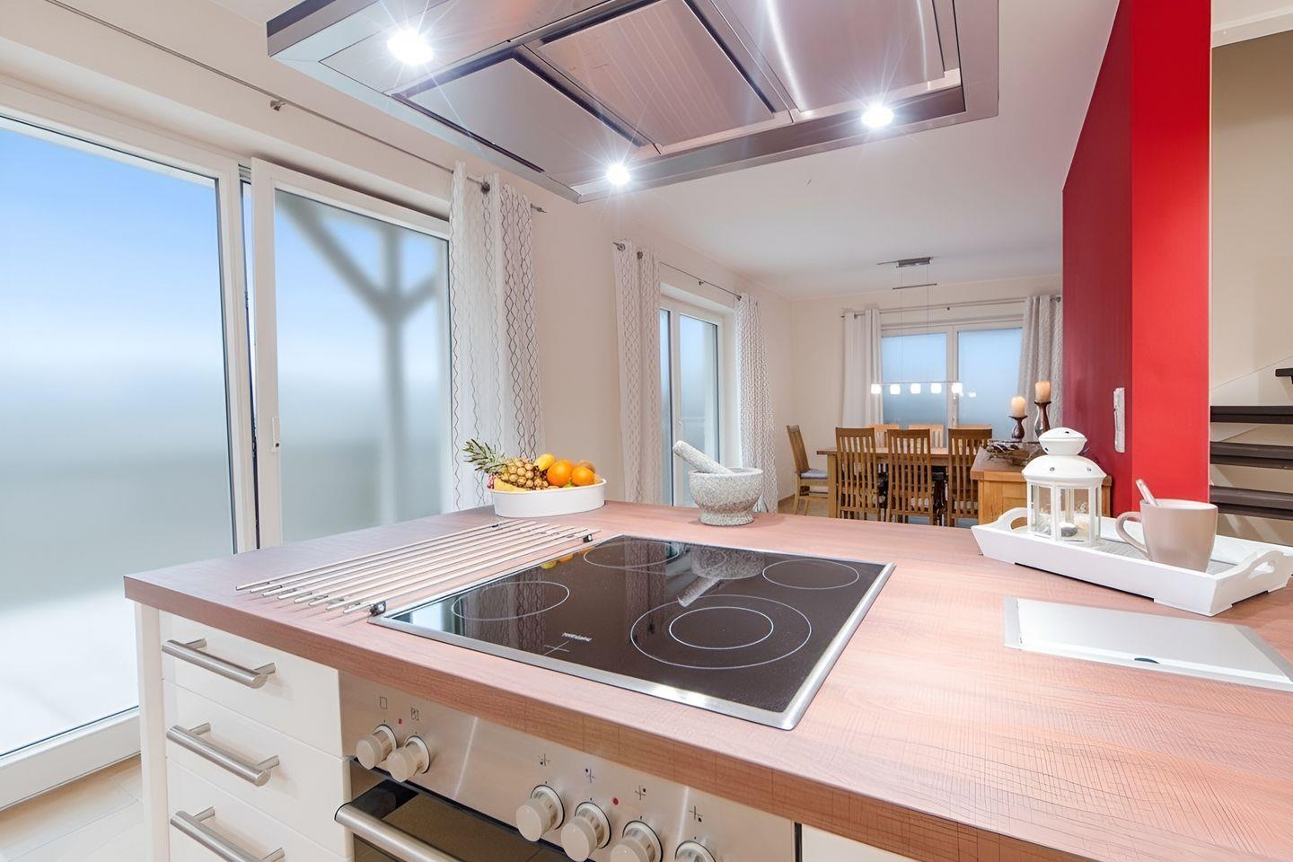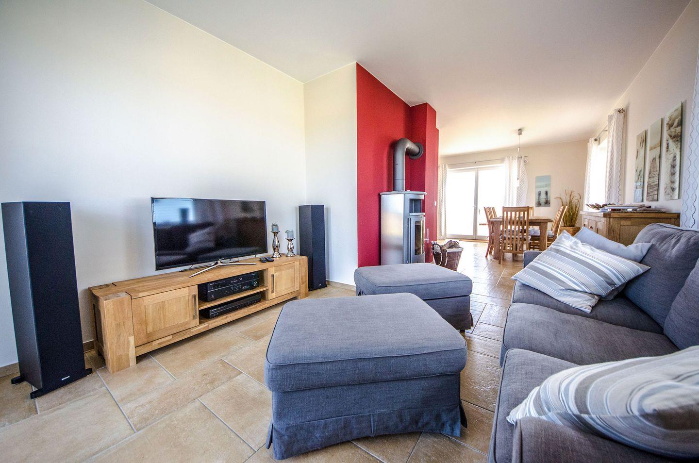 Im offenen Wohnbereich erwartet Sie ein gemütliches Wohnzimmer mit Kaminofen, der zusätzliche Behaglichkeit auch an kühleren Tagen garantiert. Für Unterhaltung sorgen ein moderner Smart-TV, eine HiFi-Anlage sowie ein Blu-ray-Player. Die offene Küche ist hochwertig ausgestattet und verfügt unter anderem über Backofen, Herd, Kühlschrank mit Gefrierfach, Spülmaschine, Mikrowelle, Toaster, Kaffeemaschine, Wasserkocher und umfassende Küchenutensilien. Im angrenzenden Essbereich finden alle Gäste bequem Platz am Esstisch.