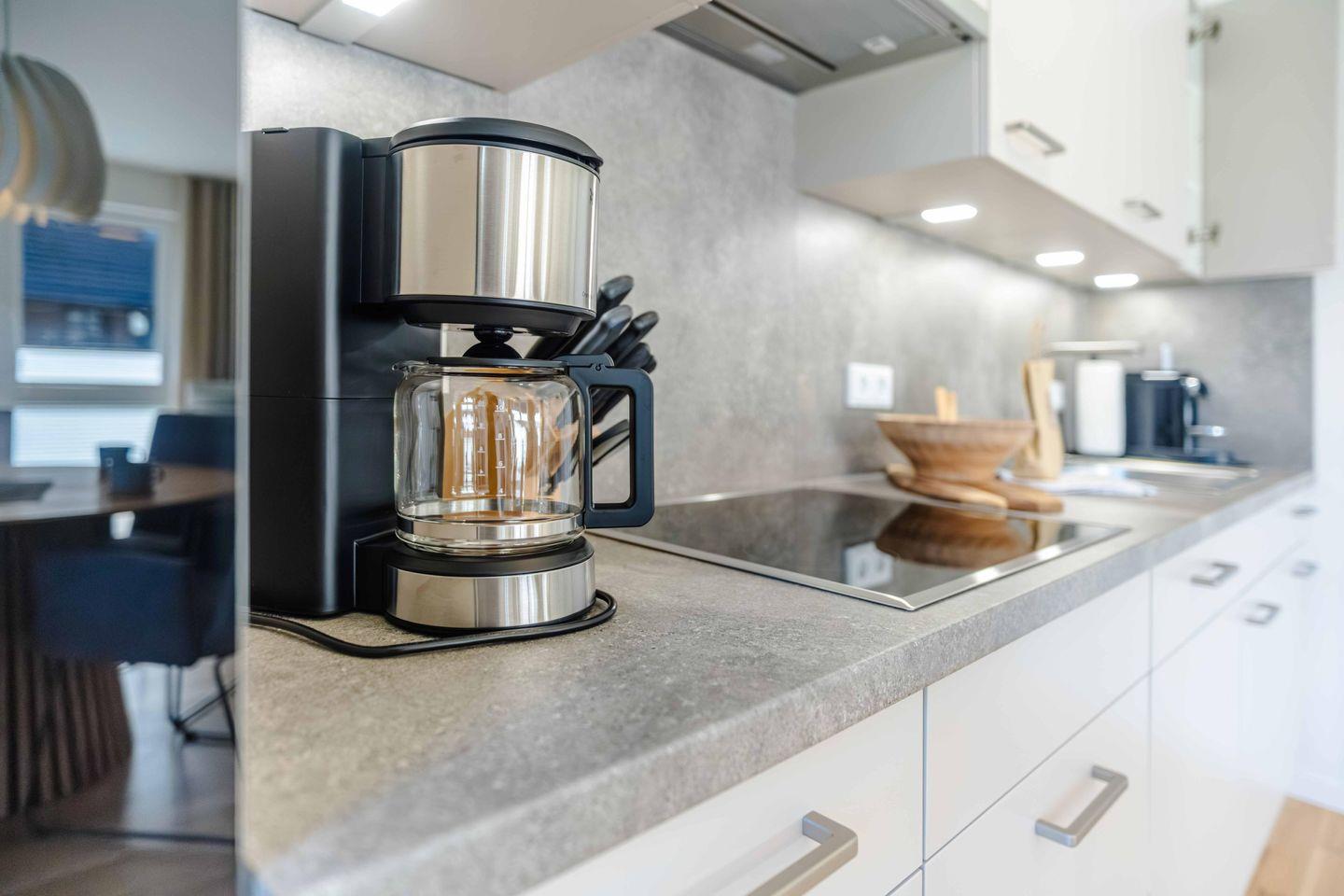 Der offene Wohn- und Essbereich lädt mit einem gemütlichen Sofa, einem Sessel und einem Esstisch für vier Personen zum Verweilen ein. Eine Garderobe bietet Platz für Jacken und Schuhe. Die angrenzende Küche ist modern und voll ausgestattet mit Induktionskochfeld, Backofen, Kühlschrank mit Gefrierfach, Spülmaschine, Filterkaffeemaschine, Nespresso-Kapselmaschine, Wasserkocher, Toaster und Handrührgerät – ideal für Hobbyköche.