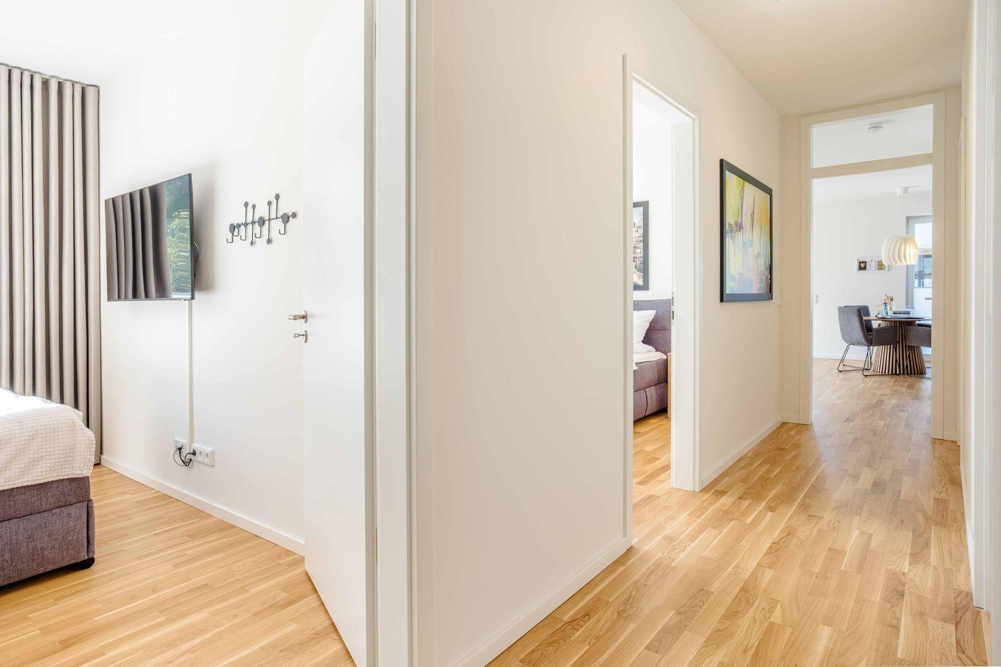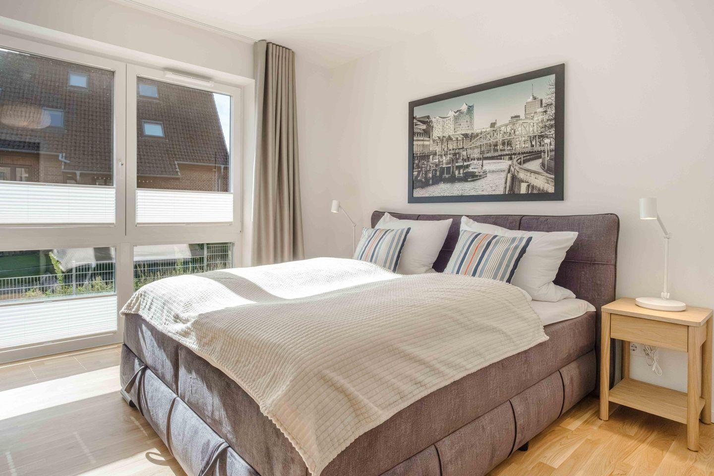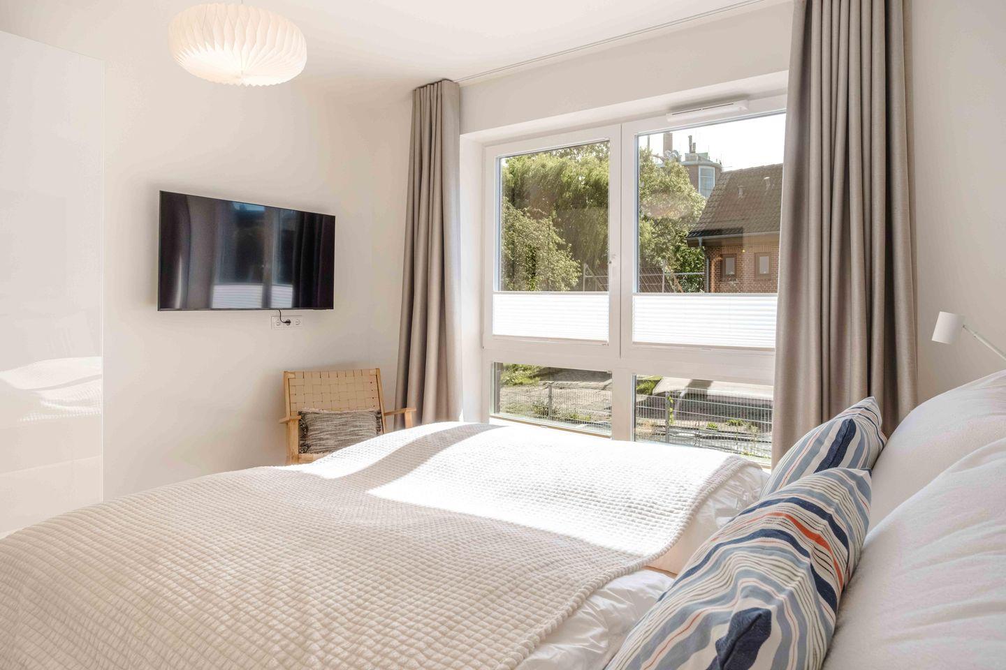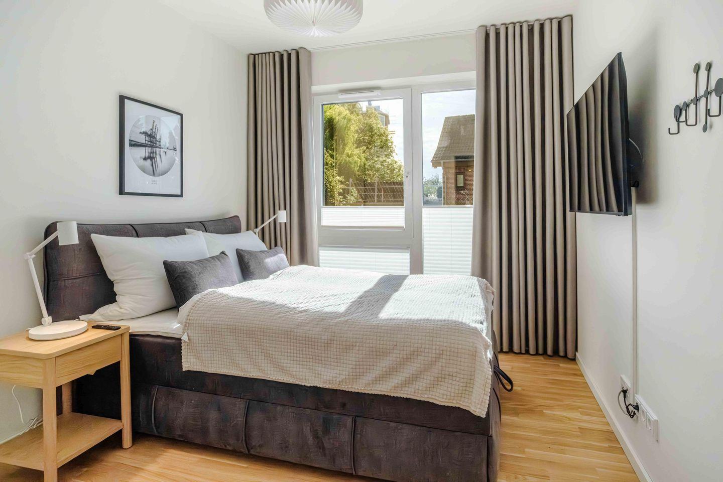 Die Ferienwohnung umfasst drei Zimmer, darunter zwei gemütliche Schlafzimmer. Im ersten Schlafzimmer erwartet Sie ein komfortables Boxspringbett (180x200 cm) mit offenem Fußende, ein geräumiger Kleiderschrank, Verdunklungsmöglichkeiten, sowie ein TV für entspannte Abende. Das zweite Schlafzimmer ist mit einem Boxspringbett (140x200 cm) ebenfalls komfortabel ausgestattet und bietet zusätzlich TV, Verdunklung und Stauraum im Kleiderschrank.
