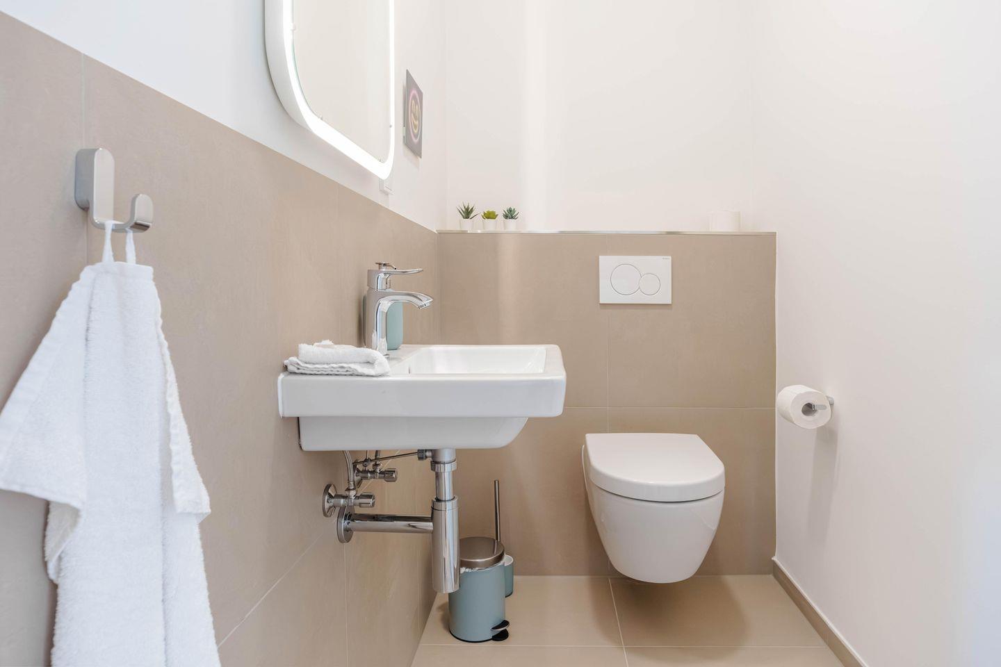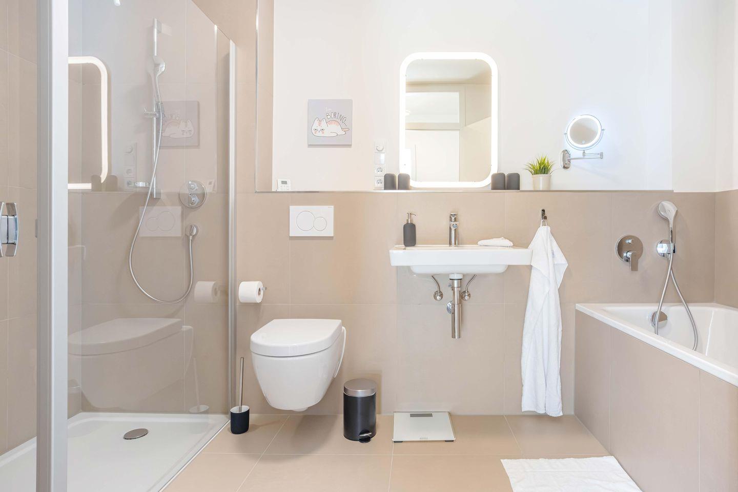Das großzügige Badezimmer verfügt über eine ebenerdige Dusche, Badewanne, Waschbecken, WC, Spiegel und Haartrockner. Zusätzlich gibt es ein separates Gäste-WC. Für längere Aufenthalte stehen eine Waschmaschine, Bügeleisen, Bügelbrett, Wäscheständer sowie ein Staubsauger zur Verfügung.