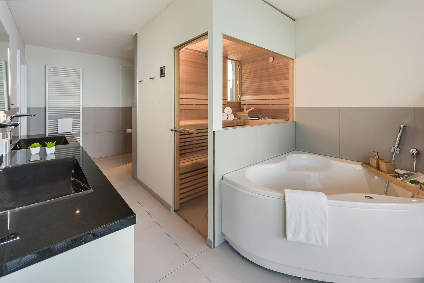 Neben dem eigenen Balkon, der mit Möbeln und Sonnenliegen ausgestattet ist, können Sie einen Elektrogrill nutzen und direkt beim Blick auf das Meer kulinarische Momente erleben. Wellnessliebhaber profitieren von einer eigenen finnischen Sauna.