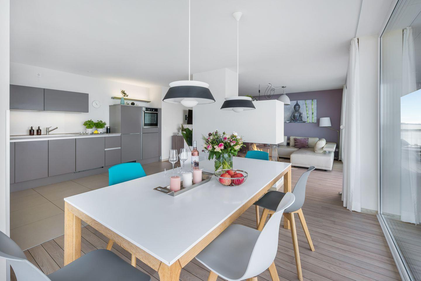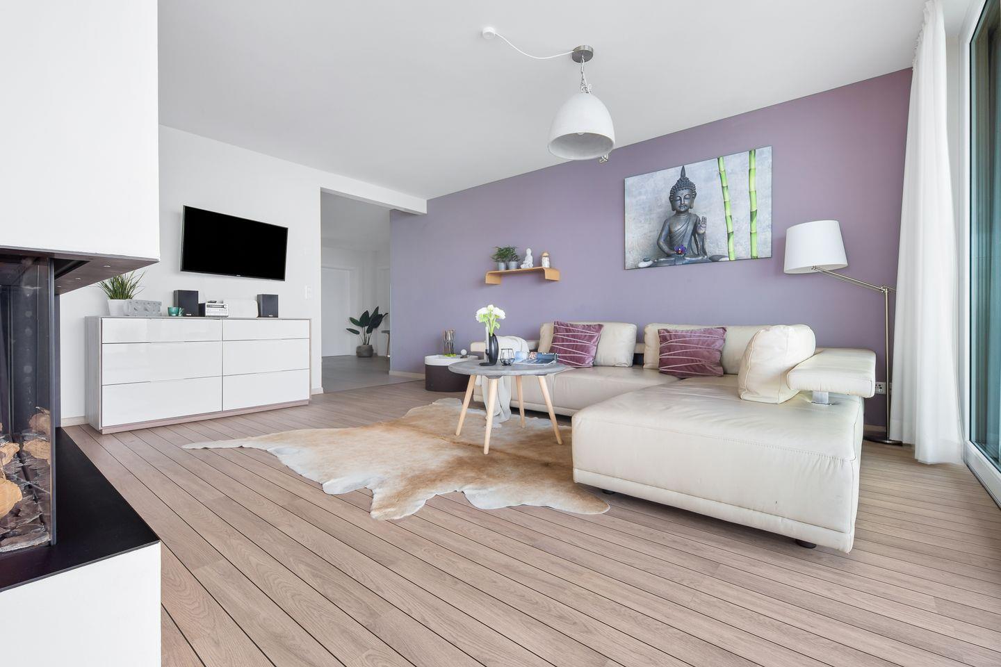 Der offen zum Wohnzimmer gestaltete Küchenbereich ist hochwertig ausgestattet und lässt keine Wünsche offen. Direkt angrenzend befindet sich ein gemütlicher Essbereich mit Esstisch, an dem Sie gemeinsame Mahlzeiten genießen können. Das großzügige Wohnzimmer lädt mit einem Gaskamin und einem bequemen Sofa zu entspannten Stunden ein.