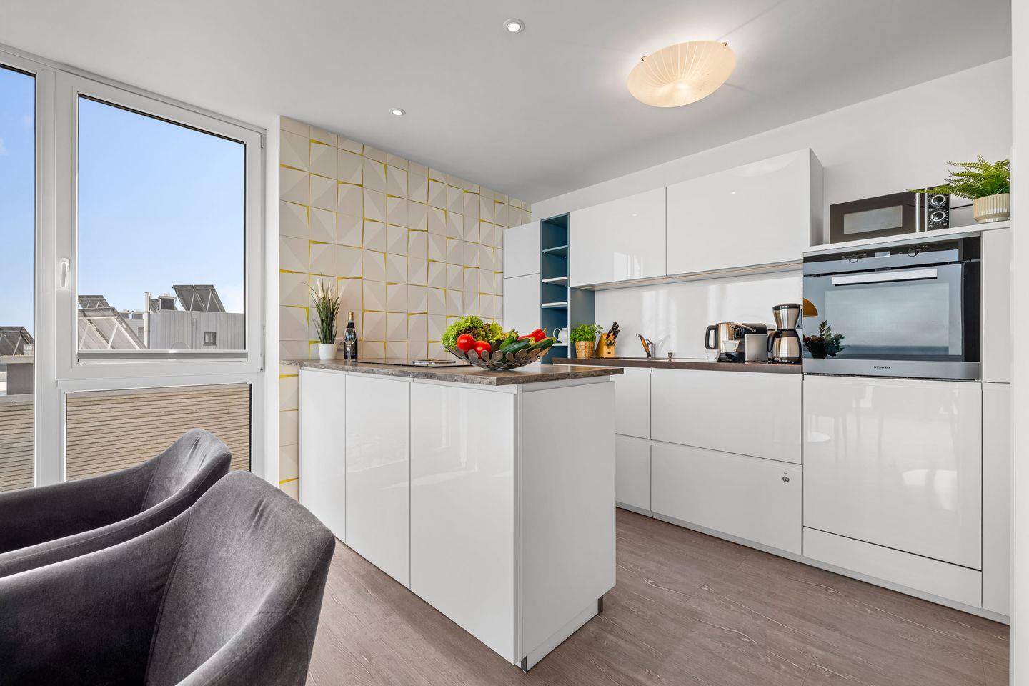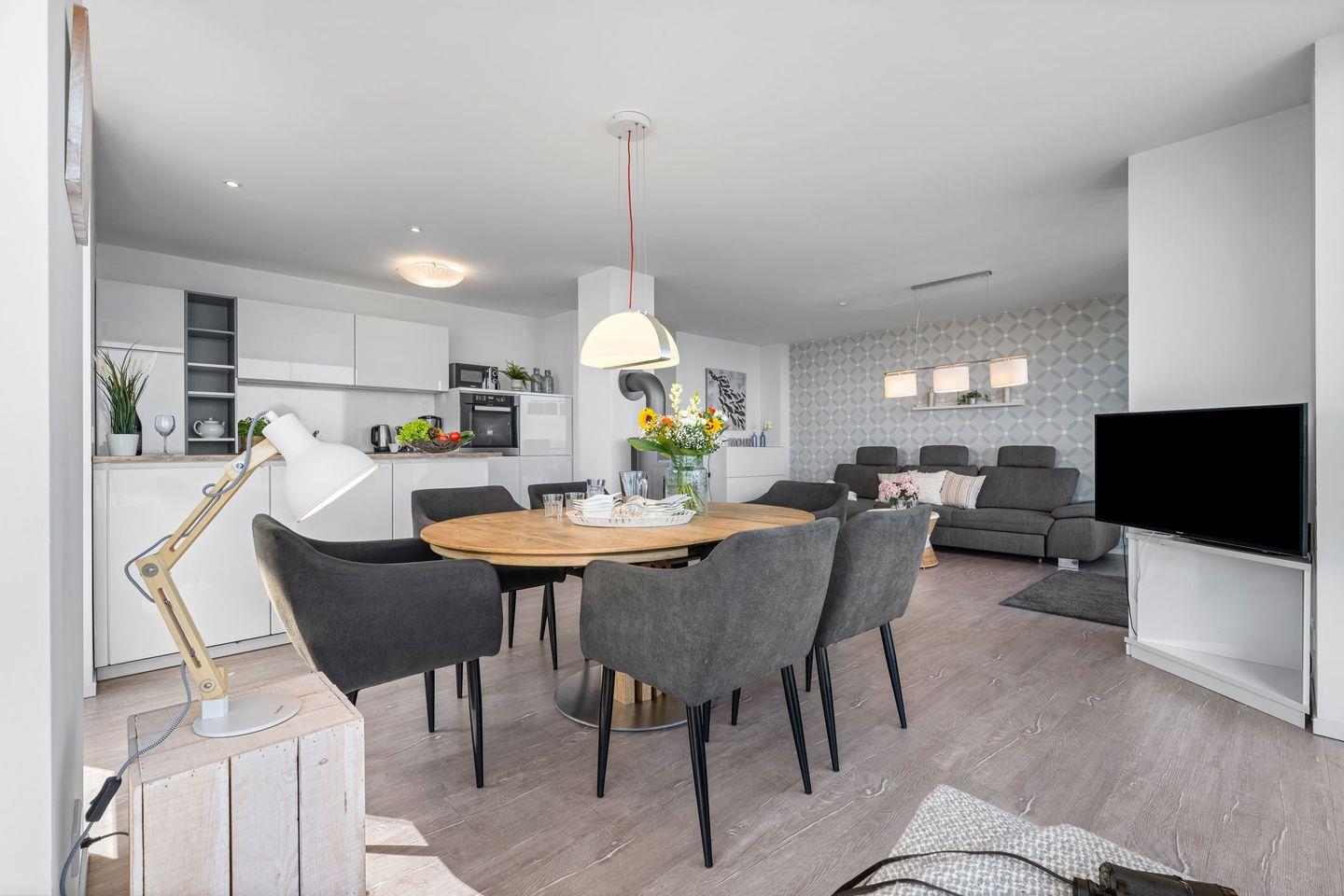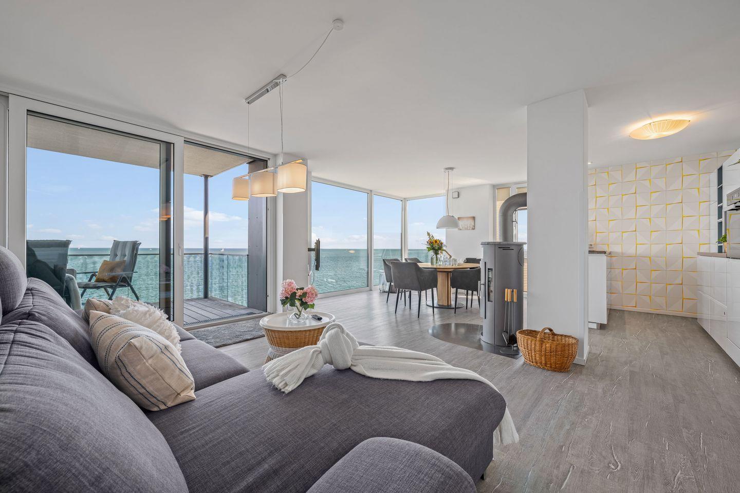 Die Ferienwohnung Küstenküche bietet auf 112 Quadratmetern Platz für bis zu sechs Personen. Der offene Wohnbereich mit Luxusküche, Esstisch, Kaminofen und Smart TV öffnet sich durch bodentiefe Fenster zur Ostsee. Die Küche in Insellösung ist komplett ausgestattet mit Induktionsherd, Mikrowelle, Espressokanne, Geschirrspüler und vielem mehr. Von hier aus gelangen Sie direkt auf den Balkon über den Wellen.