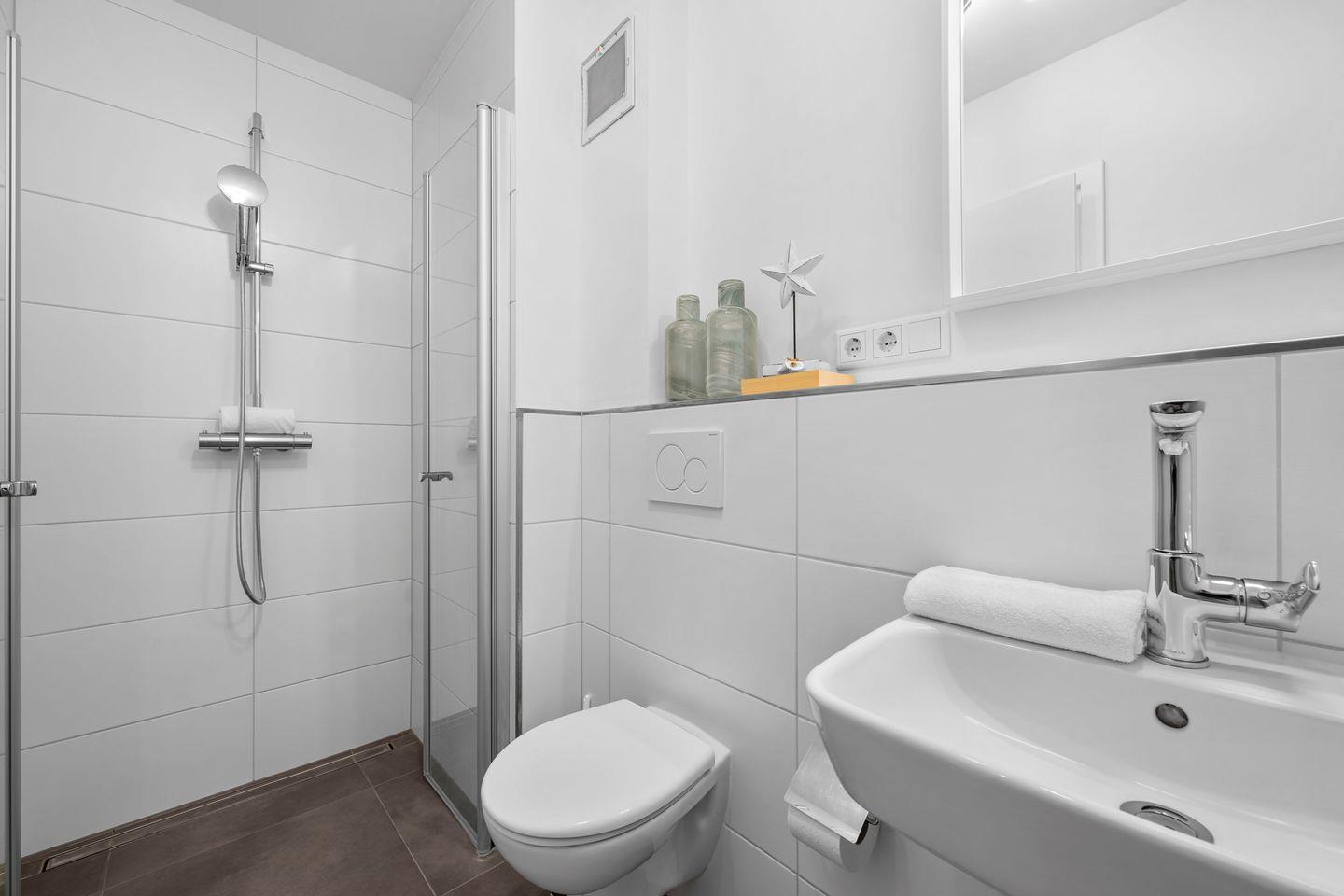 Drei Schlafzimmer stehen zur Verfügung. Zwei mit Doppelbetten und Zugang zum Sonnenbalkon Richtung Hafen, eins mit komfortabler Schlafcouch. Für Familien mit Kleinkind gibt es Hochstuhl und Kinderbett. Zwei Badezimmer sorgen für Komfort: eines mit Dusche, das andere mit Whirlwanne, bodengleicher Dusche und privater Sauna. Zusätzlich gibt es ein Gäste WC.