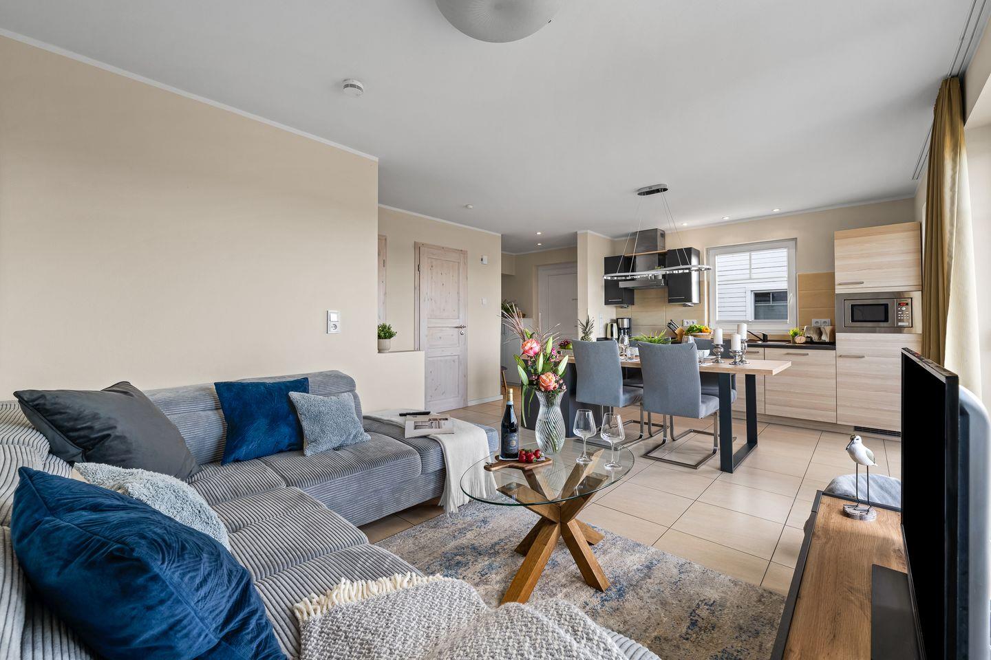 Das Herzstück von Marina Sands ist der helle Wohn- und Essbereich im Erdgeschoss. Durch bodentiefe Fenster fällt der Blick ungehindert auf das türkisblaue Wasser der Marina. Das gemütliche Sofa lädt zu entspannten Stunden ein. Ob mit einem guten Buch, bei einem Film oder einfach beim Beobachten der vorbeiziehenden Segelboote. Von hier aus treten Sie direkt auf die Terrasse, die mit ihrem maritimem Fair für ausgiebige Genussmomente sorgt. Ein Frühstück mit Sand unter den Füßen oder ein Glas Wein beim Abendlicht. Beides ist hier nur ein paar Schritte entfernt.