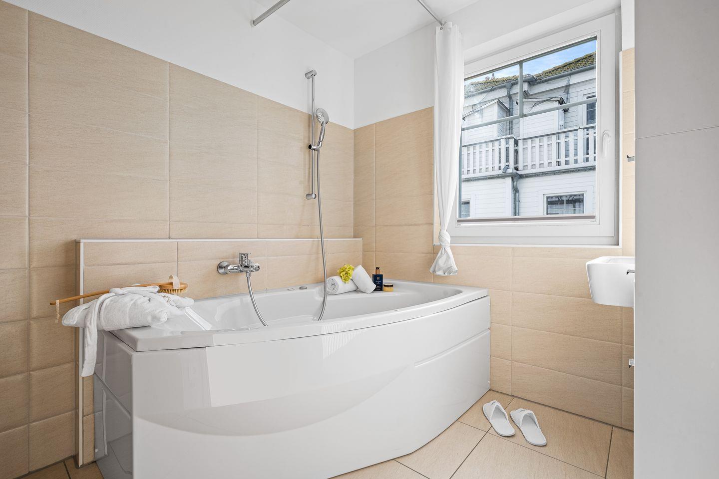 Nach einem Tag am Strand beginnt die Erholung direkt zuhause: Im Badezimmer lädt die große Badewanne mit Whirlfunktion zu entspannten Stunden ein. Das Highlight zu jeder Jahreszeit liegt jedoch ganz oben im Dachgeschoss: eine private Sauna mit Fensterfront, die den Blick über Yachthafen Olpenitz freigibt. Gleich daneben die Dachterrasse: ein Ort für tiefe Atemzüge, Sonnenuntergänge und ungestörte Momente zwischen Himmel und Wasser.