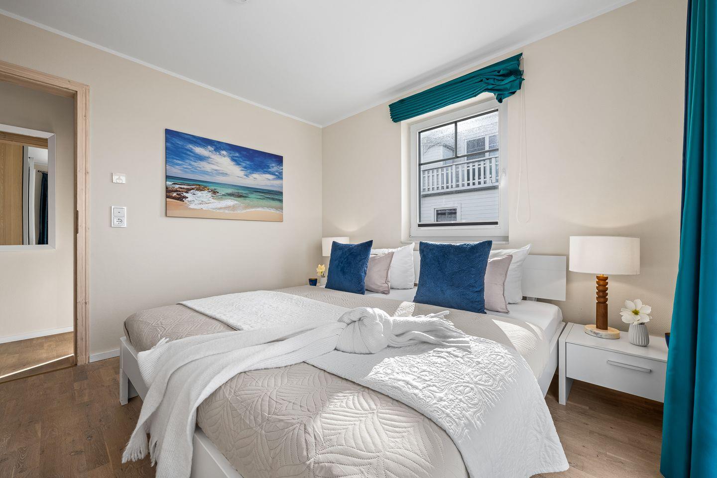Im Obergeschoss warten zwei gemütliche Schlafzimmer auf Sie. Das Hauptschlafzimmer öffnet sich zum Balkon mit direktem Blick aufs Wasser. Ein Ort, an dem der erste Kaffee am Morgen genauso besonders ist wie der Sonnenuntergang am Abend. Warme Farbtöne, weiche Kissen und viel Licht schaffen eine Atmosphäre, die Geborgenheit schenkt. Das zweite Schlafzimmer mit zwei Einzelbetten ist ideal für Kinder oder Freunde.