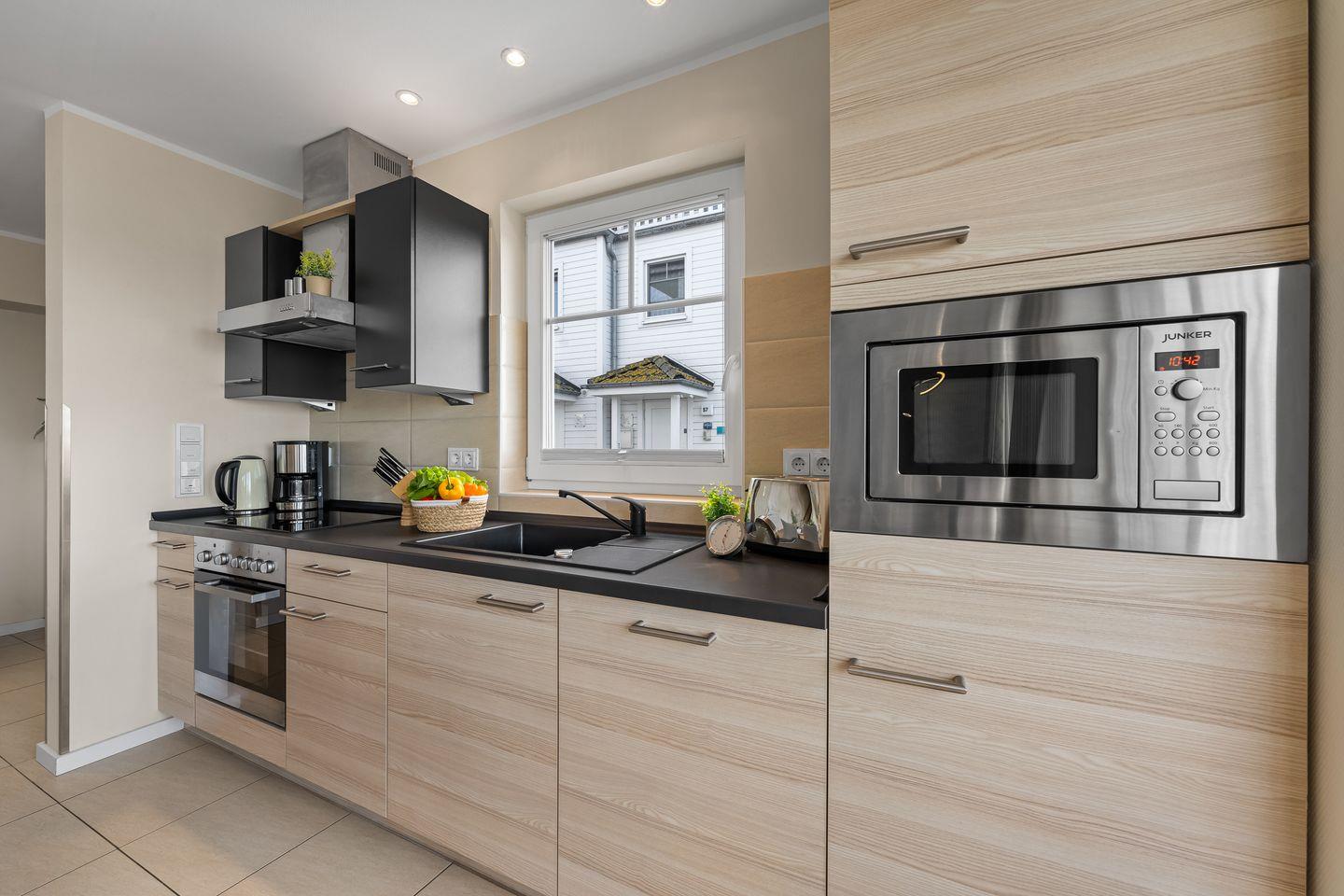 Die moderne Küche ist mit allem ausgestattet, was das Herz begehrt. Vom Kochfeld über Spülmaschine bis hin zum Backofen. Sie grenzt direkt an den Essbereich und die Terrasse, sodass die Übergänge zwischen Kochen, Genießen und Draußensein fließend sind. Für gemütliche Abende sorgt der skandinavische Kaminofen im Dachstudio: knisterndes Feuer, Blick über die Bucht - und die Zeit steht still.