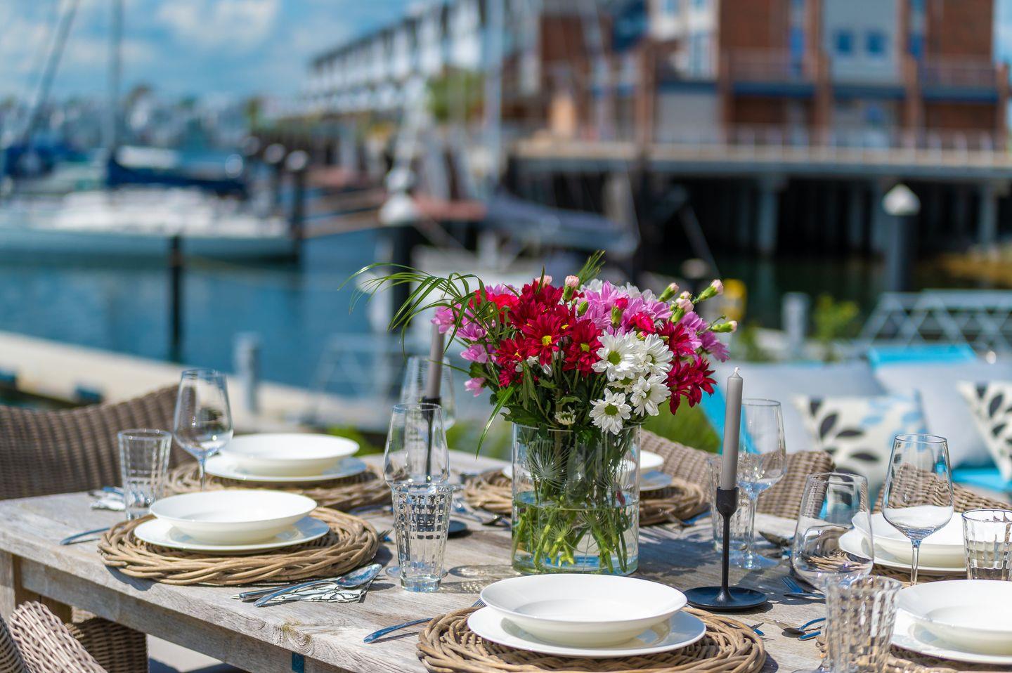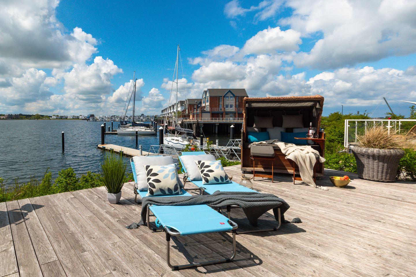 Ihre Terrasse liegt in der Sonne – vom späten Vormittag bis in den Abend. Sie frühstücken mit Blick auf die Marina, lesen im Strandkorb oder lehnen sich zurück, während die Sonne langsam untergeht. Zwei Liegestühle und ein großer Tisch machen den Platz perfekt für ruhige Momente und lange Gespräche.