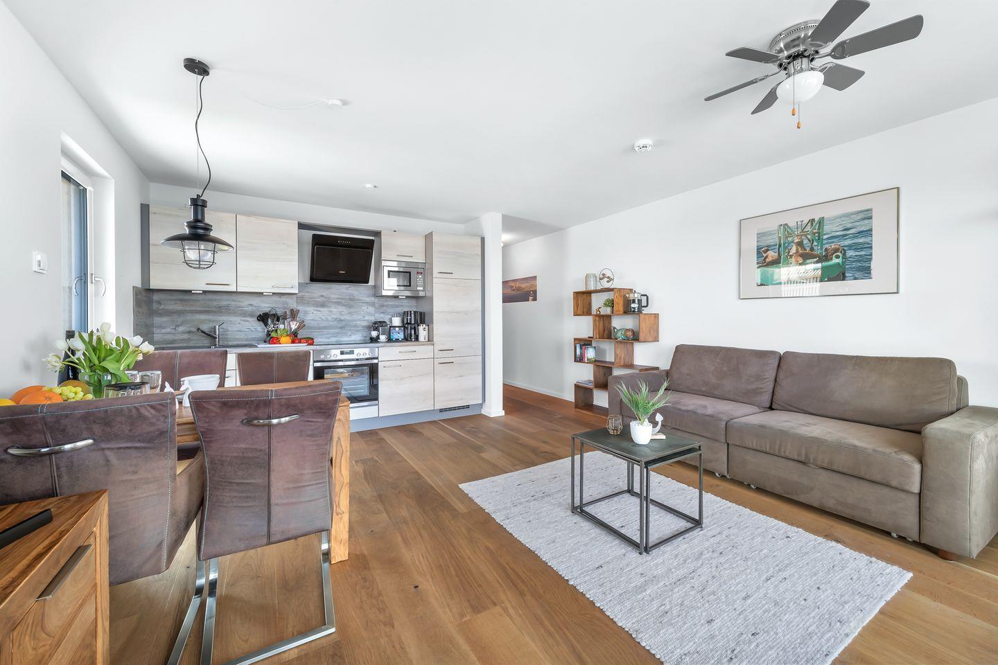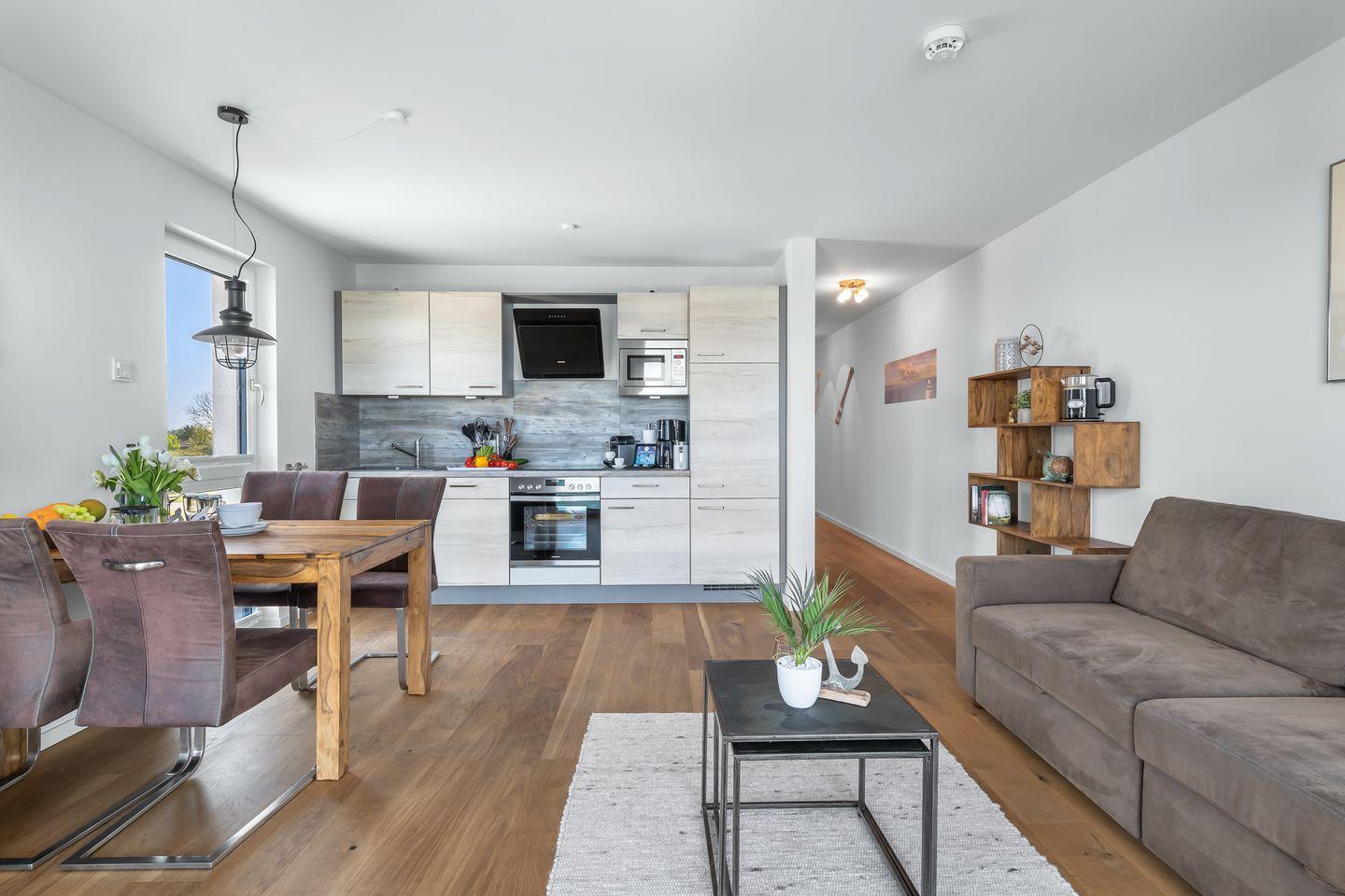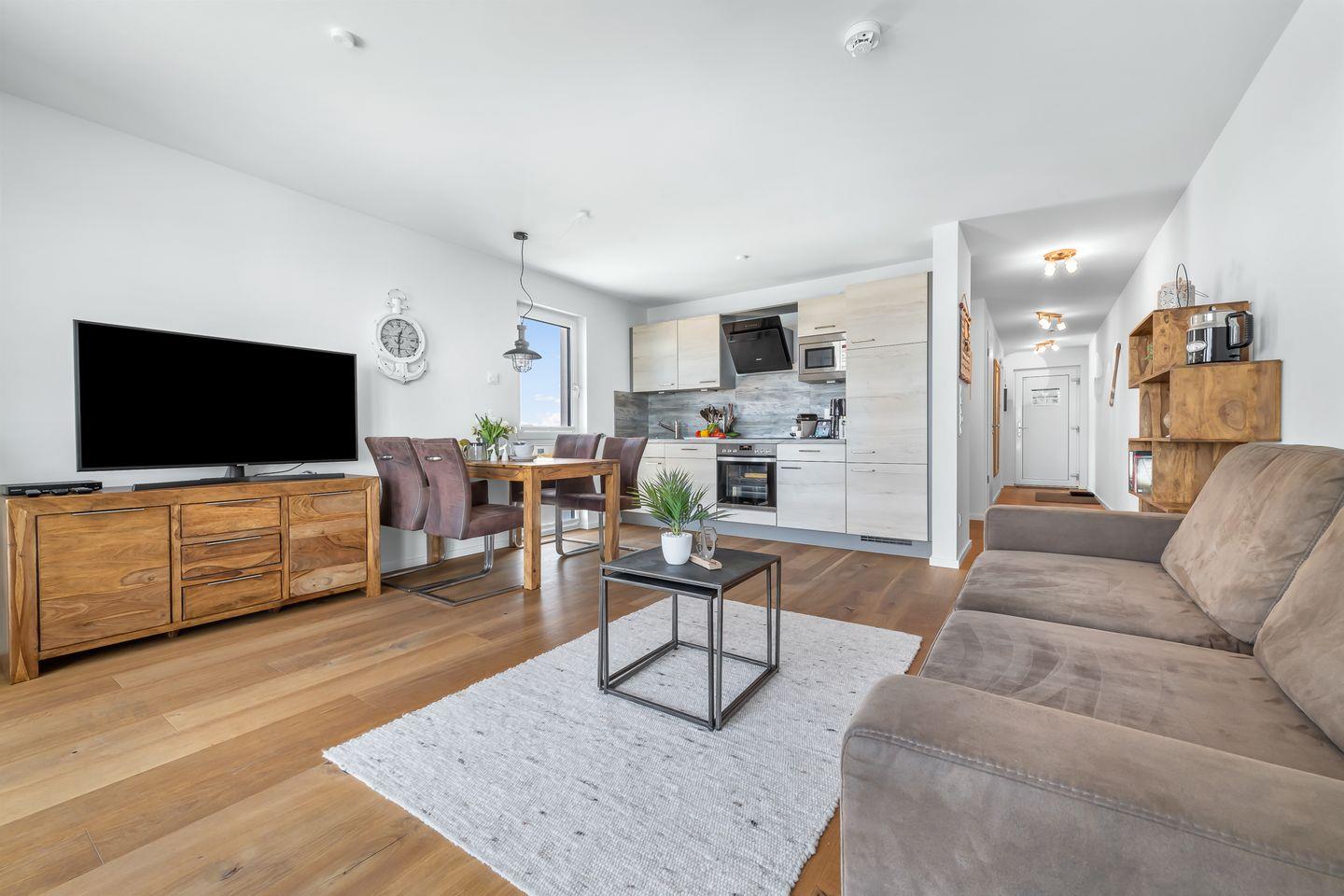 Die Wohnung empfängt Sie mit klaren Linien und moderner Ausstattung. Die offene Küche lässt kulinarische Kreativität zu, während der gemütliche Wohnbereich mit Schlafsofa und Flatscreen-TV zum Ankommen und Entspannen einlädt. Hier darf es mal gesellig, mal ganz ruhig sein – ganz so, wie Urlaub sich anfühlen soll.