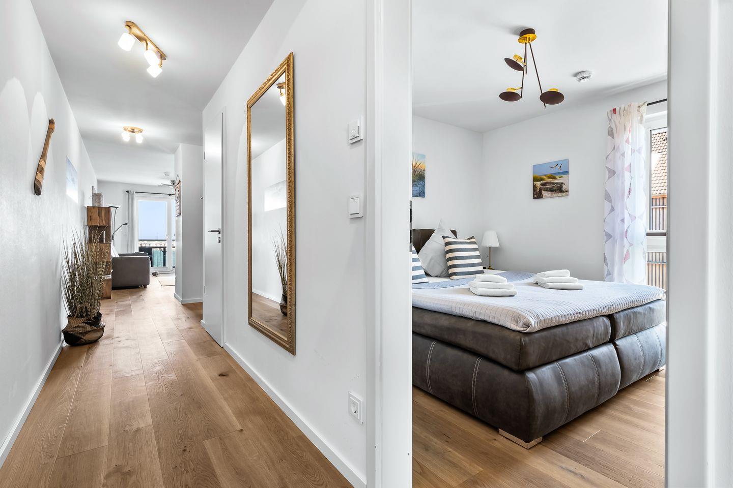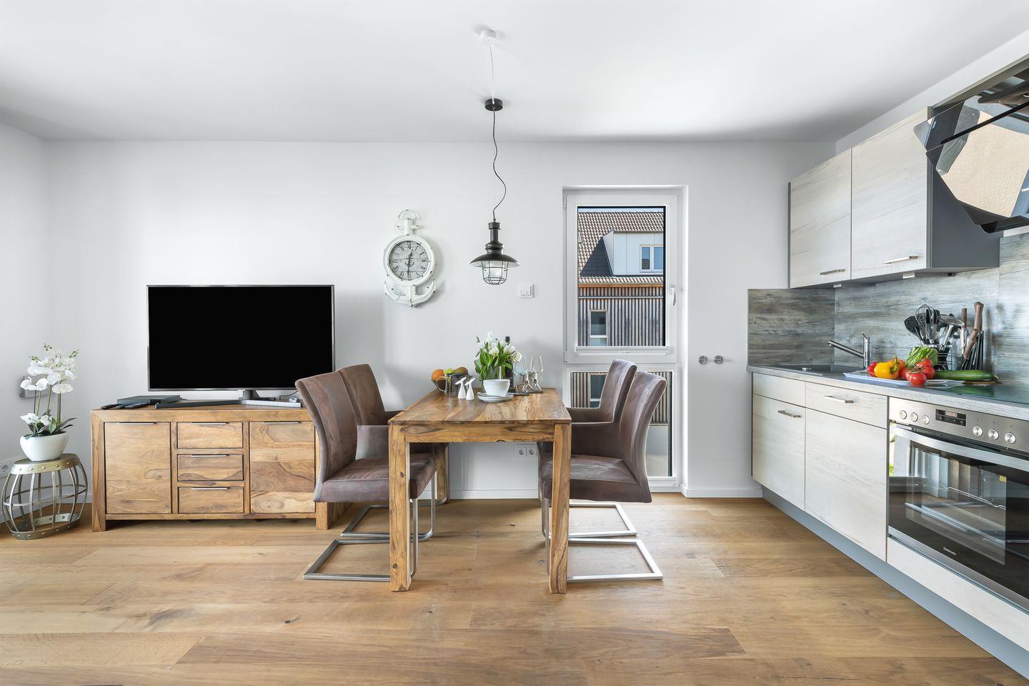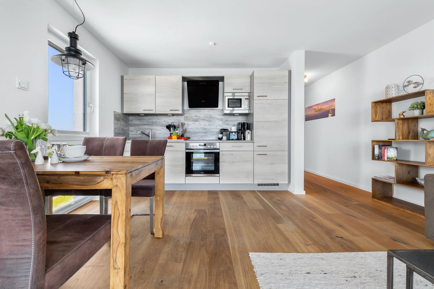 Die Wohnung empfängt Sie mit klaren Linien und moderner Ausstattung. Die offene Küche lässt kulinarische Kreativität zu, während der gemütliche Wohnbereich mit Schlafsofa und Flatscreen-TV zum Ankommen und Entspannen einlädt. Hier darf es mal gesellig, mal ganz ruhig sein – ganz so, wie Urlaub sich anfühlen soll.