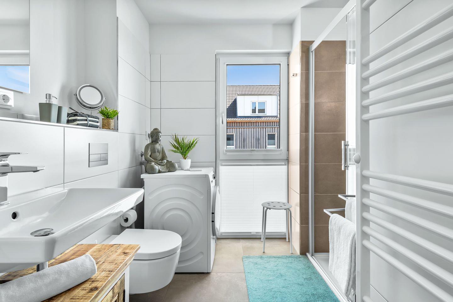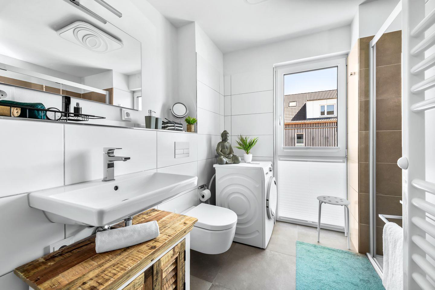 Das Duschbad überzeugt mit seiner Großzügigkeit. Die bodengleiche Dusche schenkt Bewegungsfreiheit, und das Außenfenster sorgt für Tageslicht und Weitblick – ein seltenes Detail, das den Morgen besonders macht.
