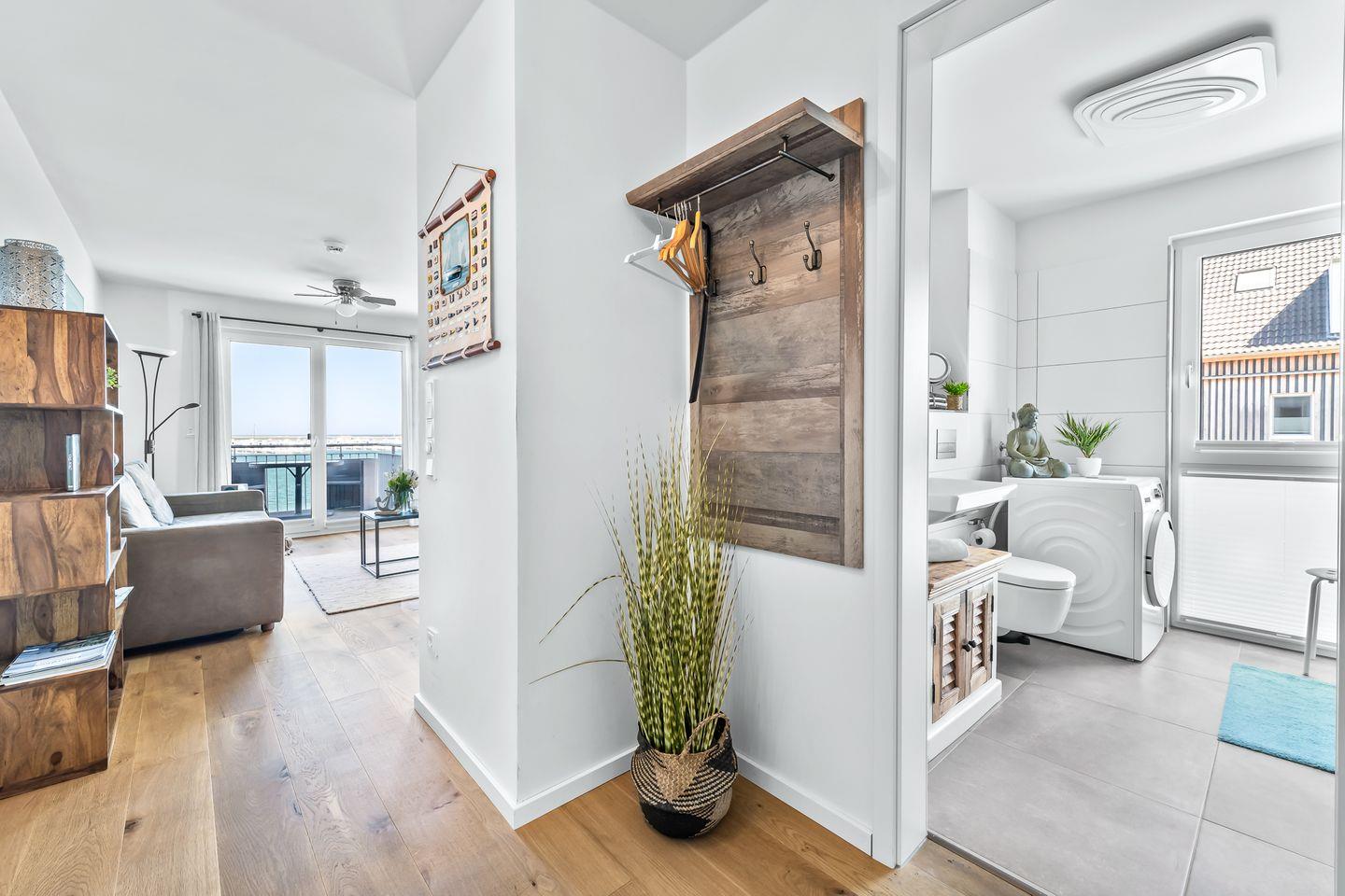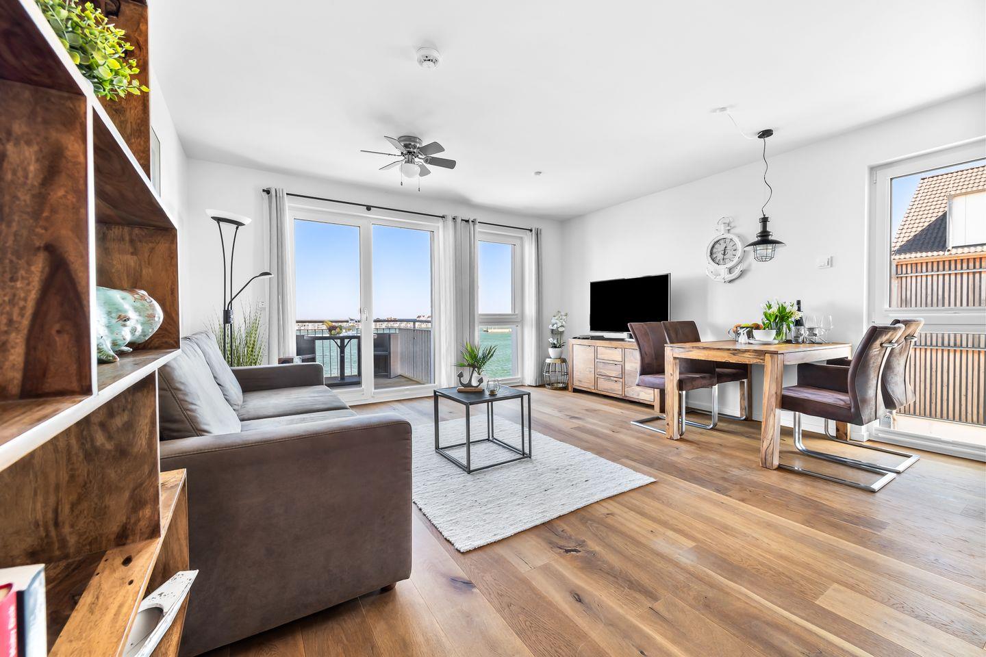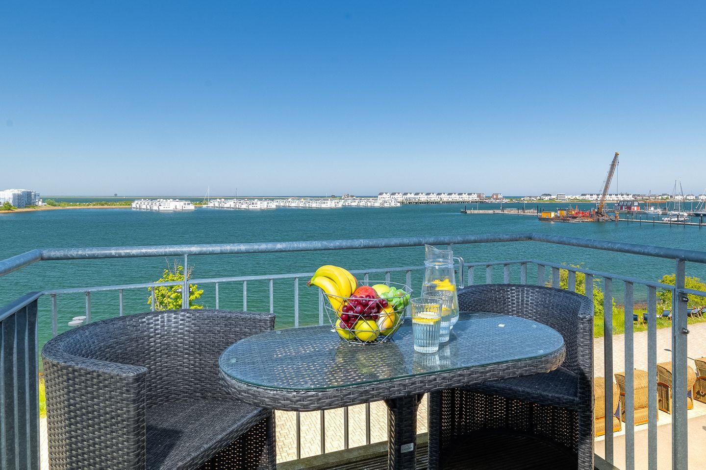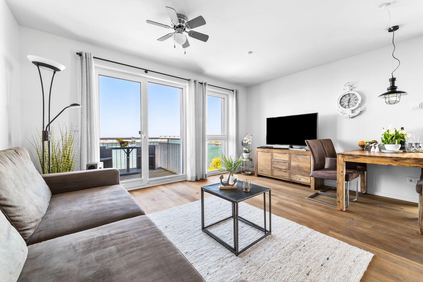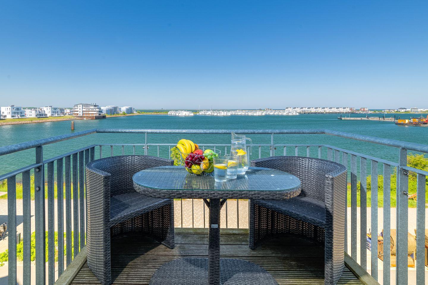Moderne Ferienwohnung Moby Dick im OstseeResort Olpenitz mit Hafenblick, Balkon und barrierearmem Komfort für erholsame Urlaubstage.