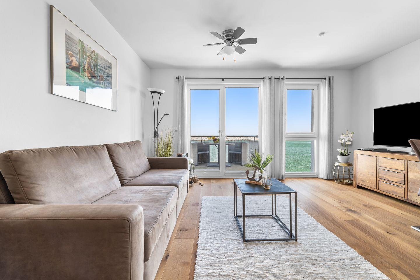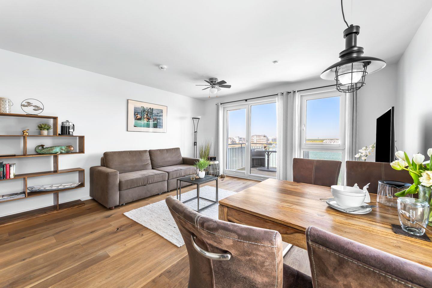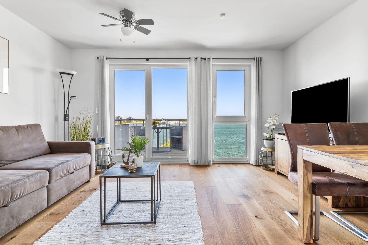Im offenen Wohn- und Essbereich verschmelzen Innen und Außen: bodentiefe Fenster holen den Hafen fast ins Wohnzimmer. Segelschiffe gleiten vorbei, Möwen kreisen, und am Abend schenkt der Himmel ein Schauspiel aus Farben. Auf dem Balkon wird jeder Sundowner zum besonderen Moment – Hafenkino in der ersten Reihe.