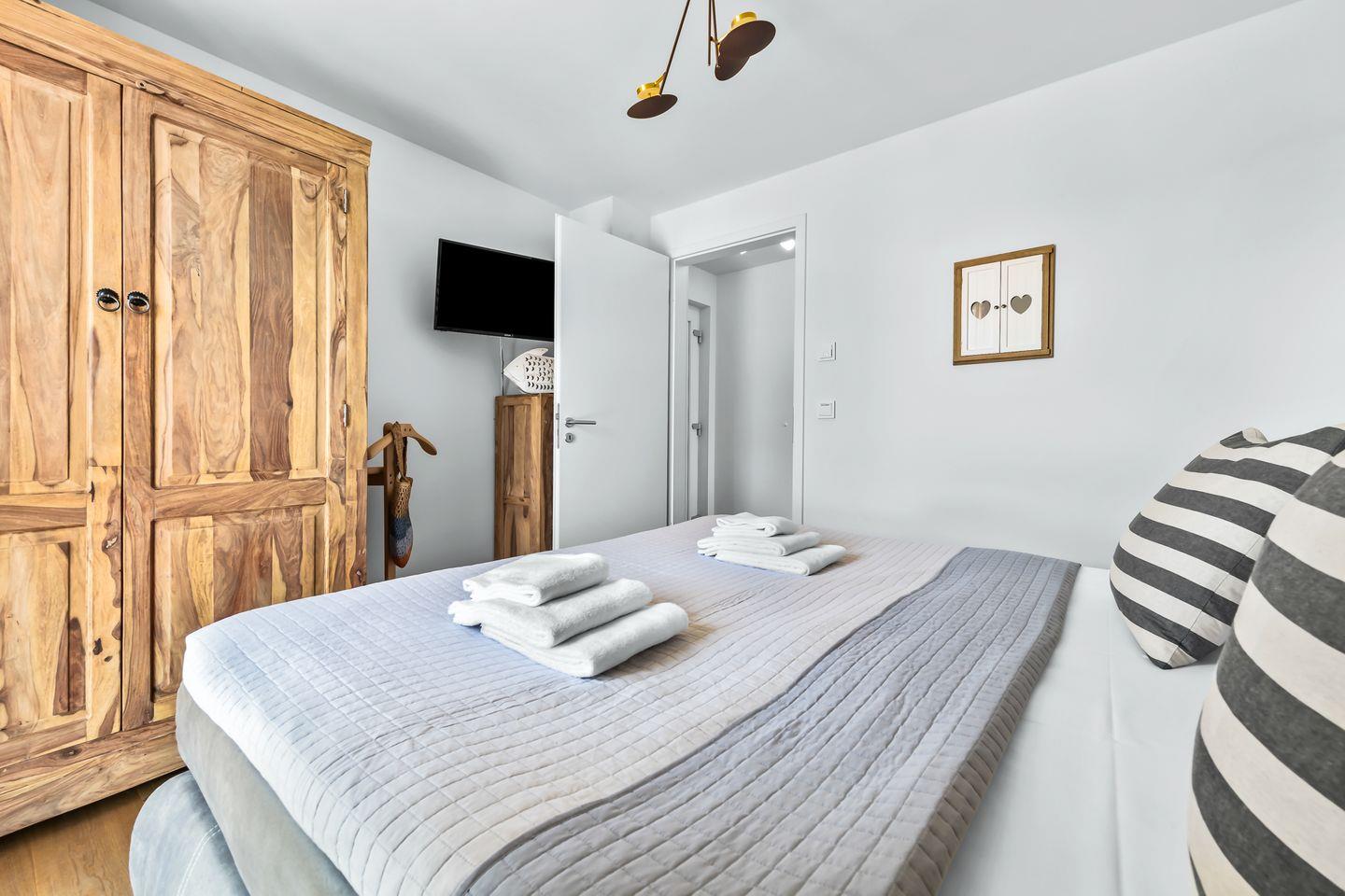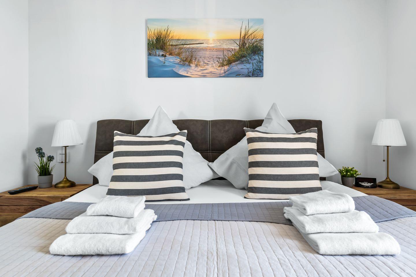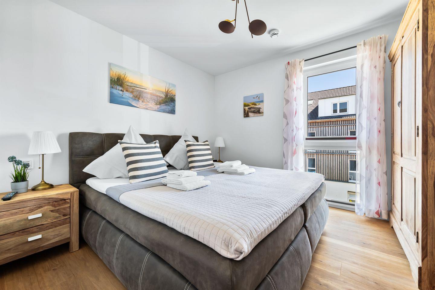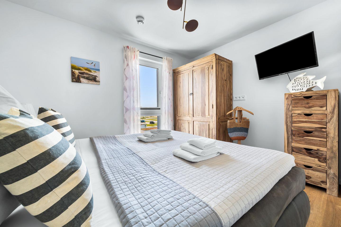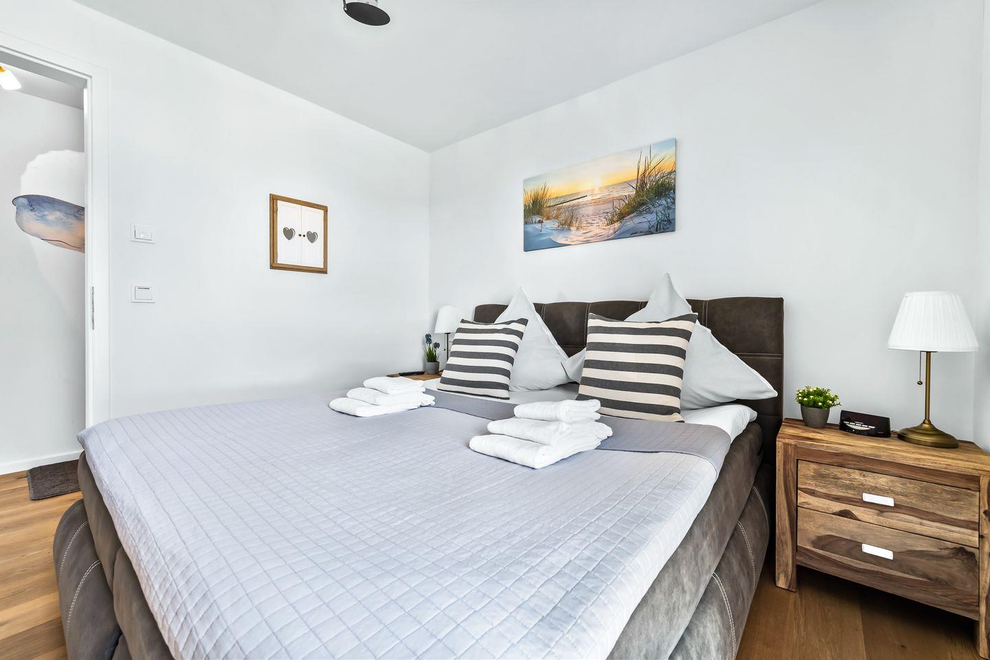 Das Schlafzimmer ist ein Rückzugsort für erholsamen Schlaf. Das Doppelbett verspricht Ruhe, während Frühaufsteher durch das Fenster mit einem Blick auf den Sonnenaufgang belohnt werden. Ein weiterer Schlafplatz auf dem Schlafsofa macht die Wohnung auch für drei Gäste komfortabel.