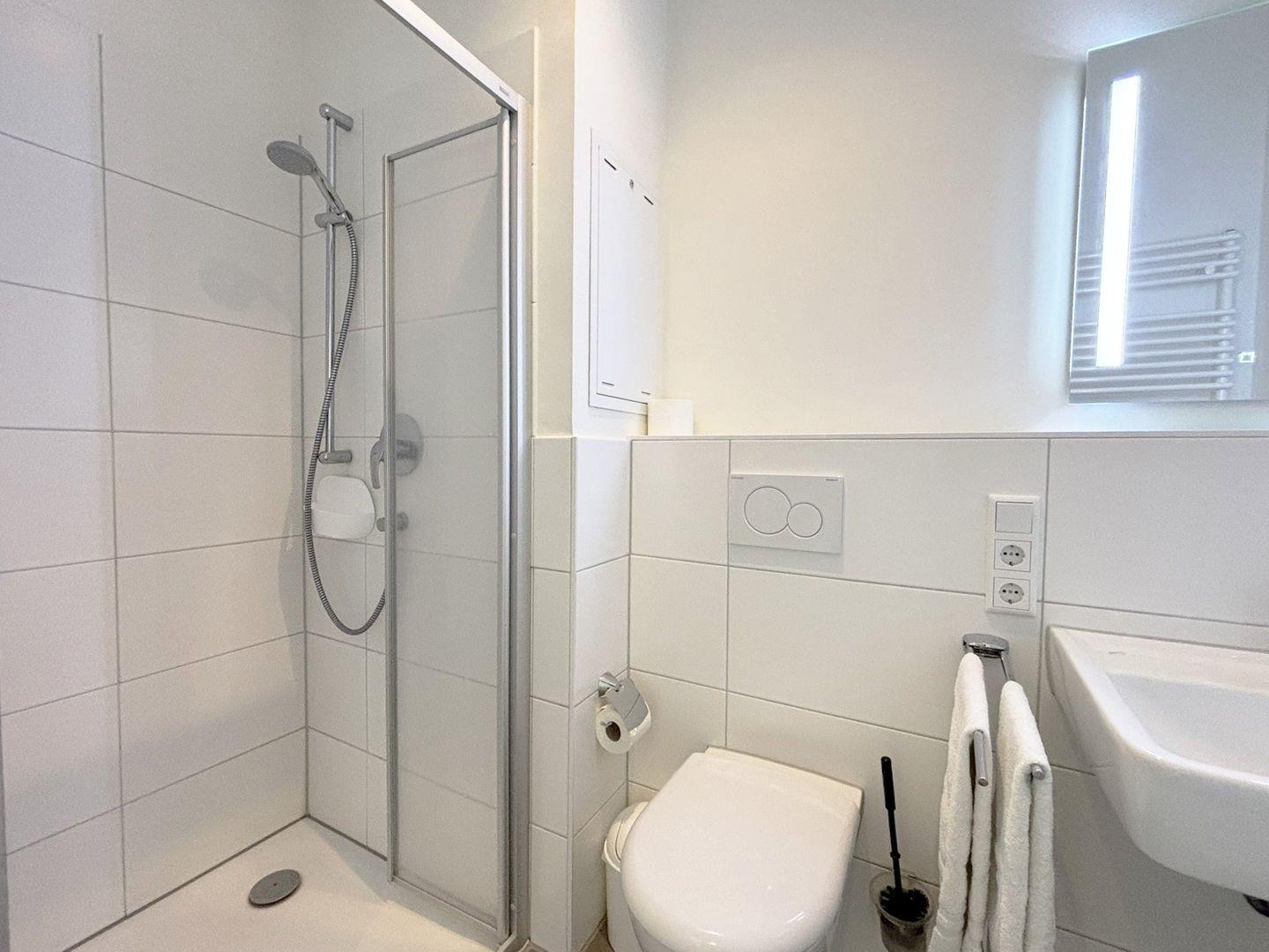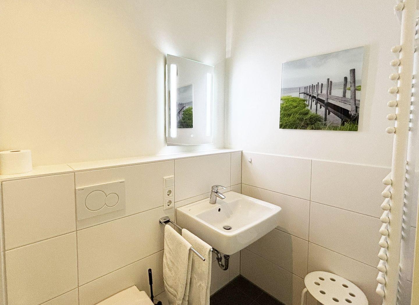 Im modernen Badezimmer erwartet Sie eine ebenerdige Dusche, ein WC, ein Waschbecken, ein Spiegel sowie ein Föhn – alles in gepflegtem, zeitgemäßem Stil. Als besonderes Highlight steht Ihnen in der Wohnung eine eigene Infrarotkabine zur kostenfreien Nutzung zur Verfügung – ideal für entspannte Stunden nach einem Tag am Strand oder bei kühlerem Wetter. Zusätzlich profitieren Sie von der kostenfreien Nutzung des Wellnessbereichs im Haus 3, der mit beheiztem Pool, Sauna und einem stilvollen Ruheraum ausgestattet ist (sofern verfügbar!).