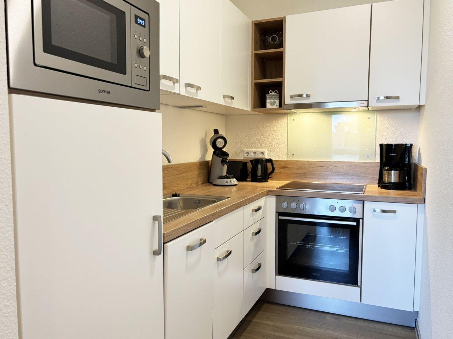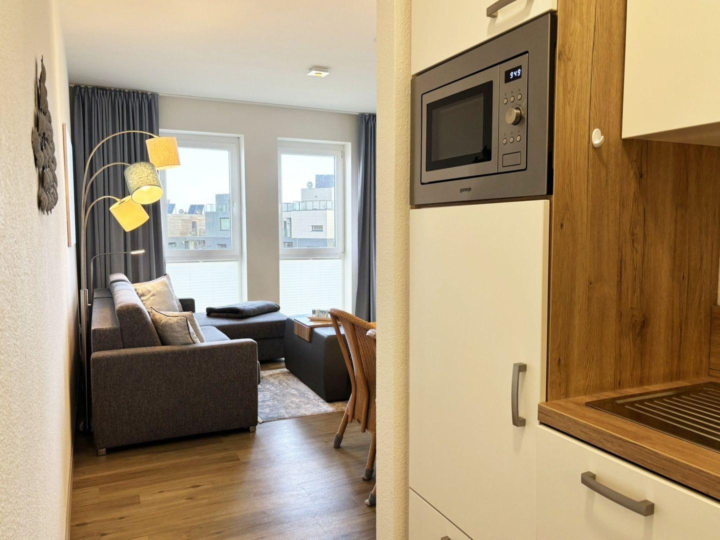 Die offene Küche ist umfassend ausgestattet und lässt keine Wünsche offen: Neben Cerankochfeld, Backofen, Mikrowelle, Kühlschrank mit Gefrierfach und Geschirrspülmaschine stehen Ihnen auch eine Filterkaffeemaschine, eine Senseo-Padmaschine, Wasserkocher, Toaster, Handrührgerät und ein Eierkocher zur Verfügung – perfekt für eine flexible Selbstversorgung.