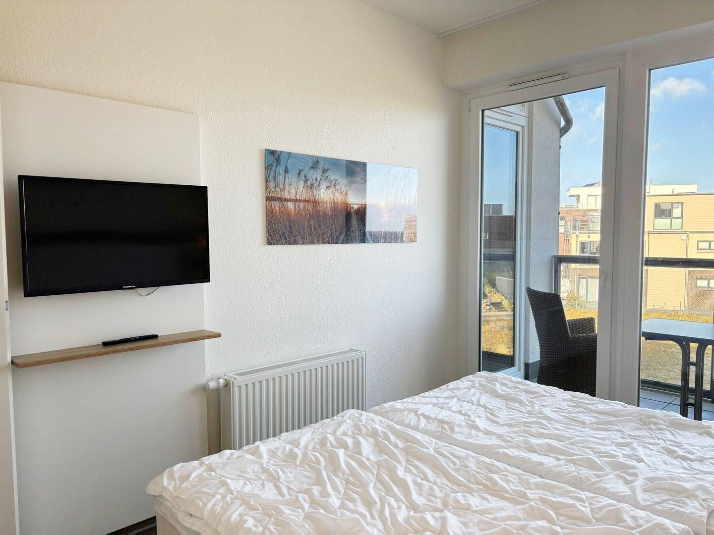 Das separate Schlafzimmer ist mit einem komfortablen Doppelbett (180x200 cm, getrennte Matratzen, offenes Fußende), einem geräumigen Kleiderschrank sowie einem Fernseher ausgestattet. Gardinen ermöglichen Verdunkelung für erholsame Nächte. Der kombinierte Wohn- und Essbereich lädt mit einem bequemen Schlafsofa (150x200 cm), einem großen Flachbildfernseher und einem gemütlichen Essplatz zum Verweilen ein. Die bodentiefen Fenster lassen viel Licht herein und führen direkt auf den überdachten Balkon (Platz für 2 Personen), auf dem Sie mit Blick auf die Umgebung entspannte Stunden genießen können.