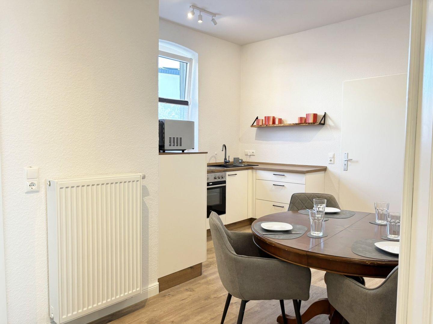 Der Essbereich mit angrenzender Küche ist funktional und modern gestaltet. Hier finden Sie einen Esstisch mit vier Stühlen sowie eine gut ausgestattete Küchenzeile mit Cerankochfeld, Backofen, Mikrowelle, Kühlschrank mit Gefrierfach, Filterkaffeemaschine, Padmaschine, Wasserkocher und Toaster – perfekt für eine komfortable Selbstverpflegung.