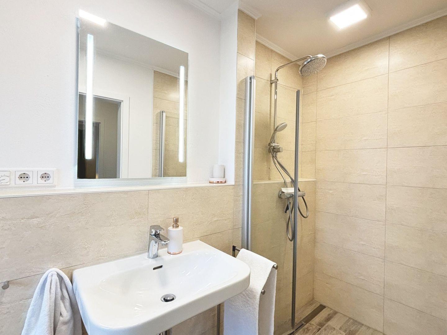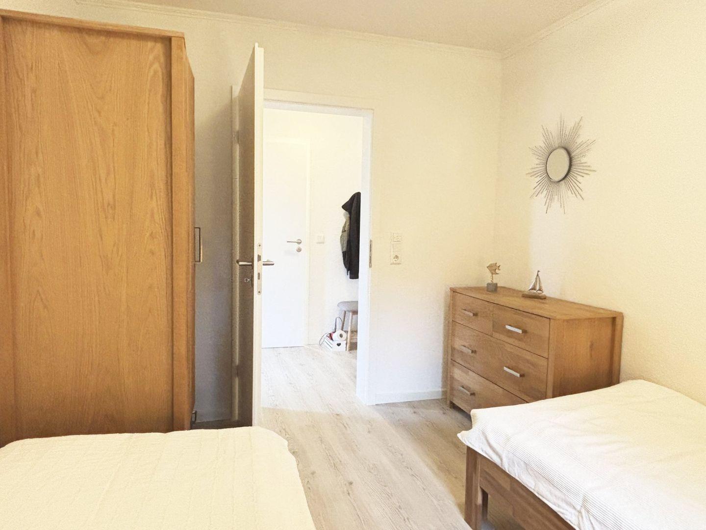 Zwei separate Schlafzimmer sorgen für erholsame Nächte: Das erste ist mit einem Doppelbett und einem Kleiderschrank ausgestattet, das zweite bietet zwei Einzelbetten, ebenfalls einen Schrank sowie eine zusätzliche Kommode. Das Badezimmer verfügt über eine bodengleiche Dusche, Tageslicht und ein modernes Design.